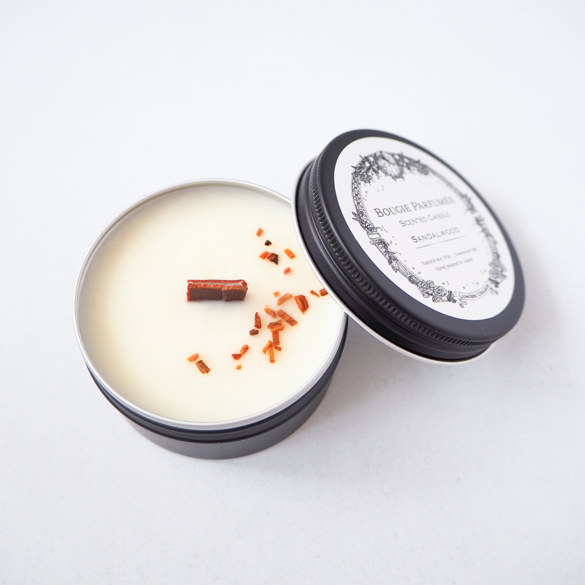 素材:ソイワックス、天然精油、インド・マイソール産老山白檀、木芯、スチール缶(日本製)
