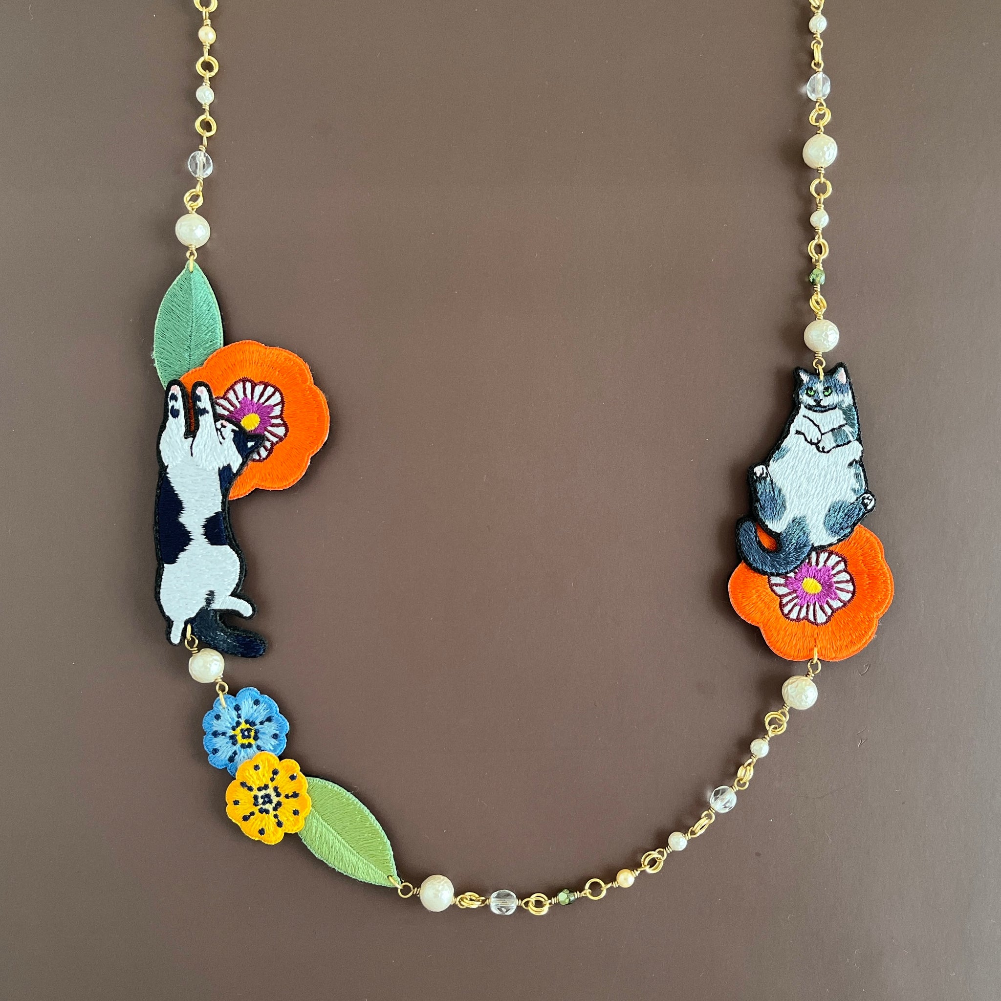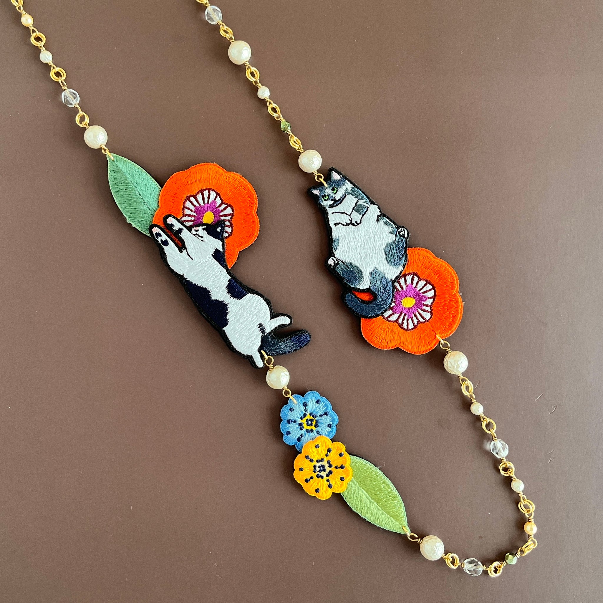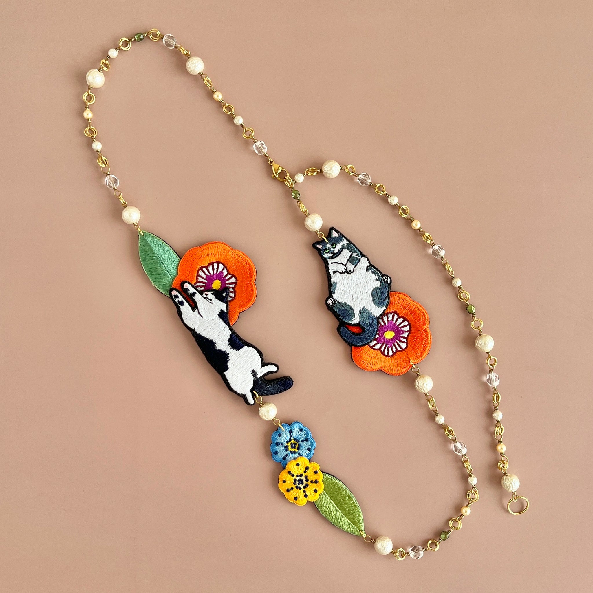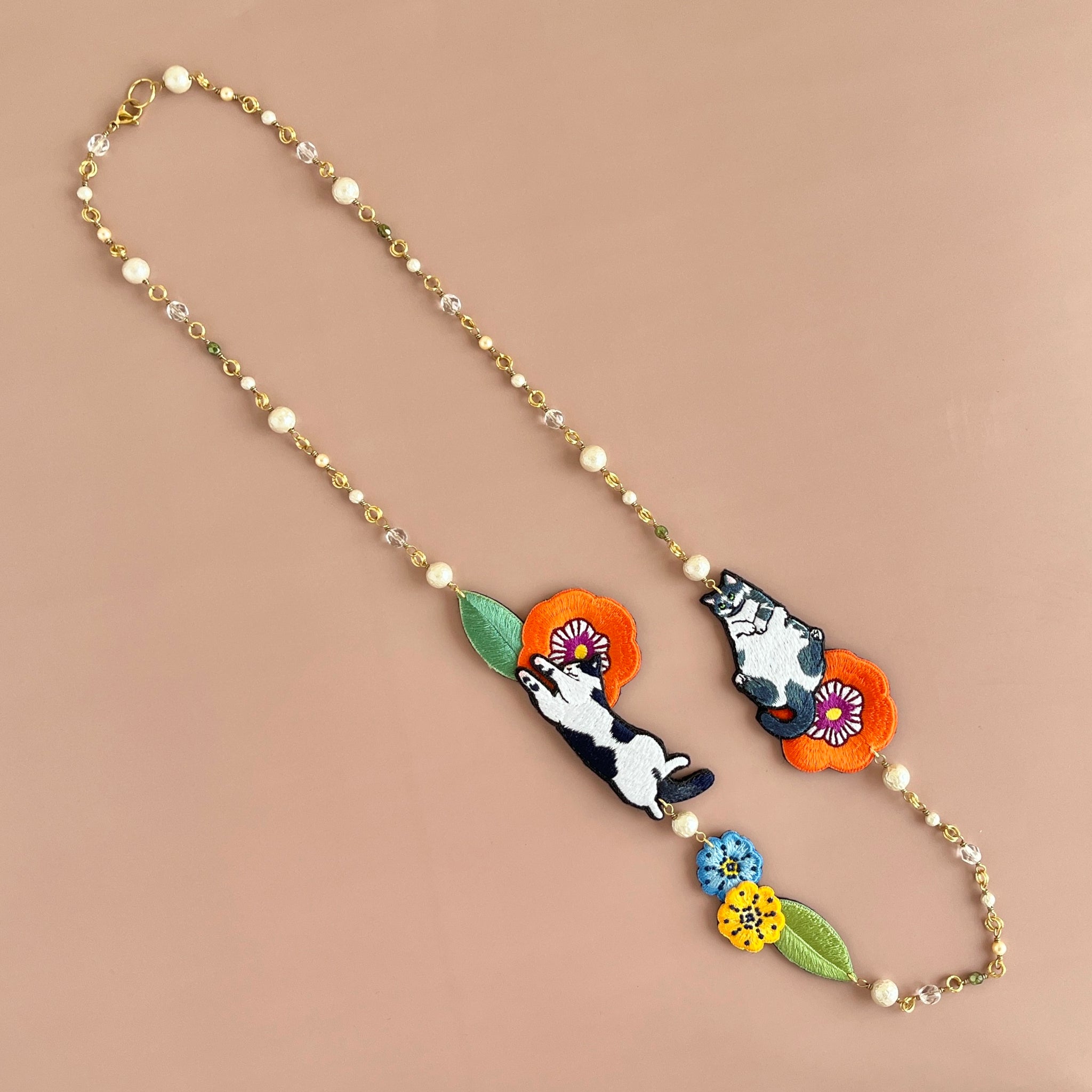 お花に囲まれて気持ちよさそうにお昼寝するねこちゃんたちの首飾りです。