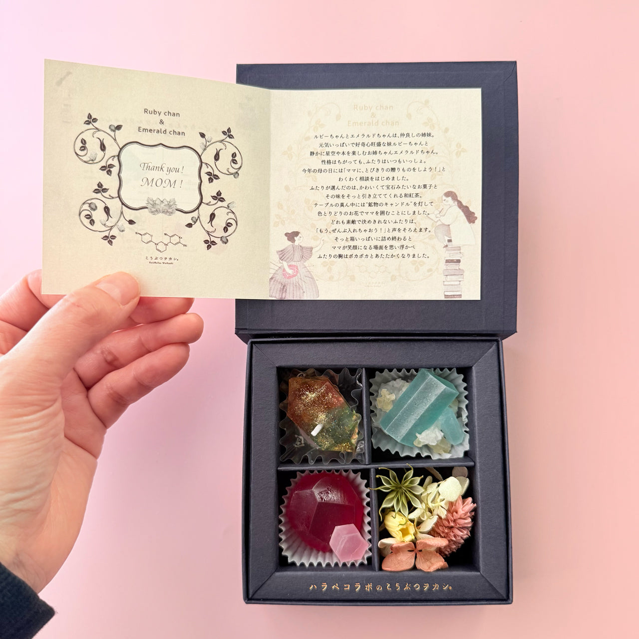 ハラペコラボ(harapecolab)は、“ArtなFoodであそぶ”をコンセプトに美味しい料理と楽しい空間を提供しているフードクリエイター集団です。代表作に琥珀糖を宝石や鉱物に見立てて制作した「こうぶつヲカシ」、そのこうぶつヲカシのきらめきを閉じ込めた「宝石のカッサータ」、一本のサラダの道「サラダロード」で演出するケータリング、ArtなFoodを家庭で気軽に演出するためのオリジナルグッズの販売などをしています。