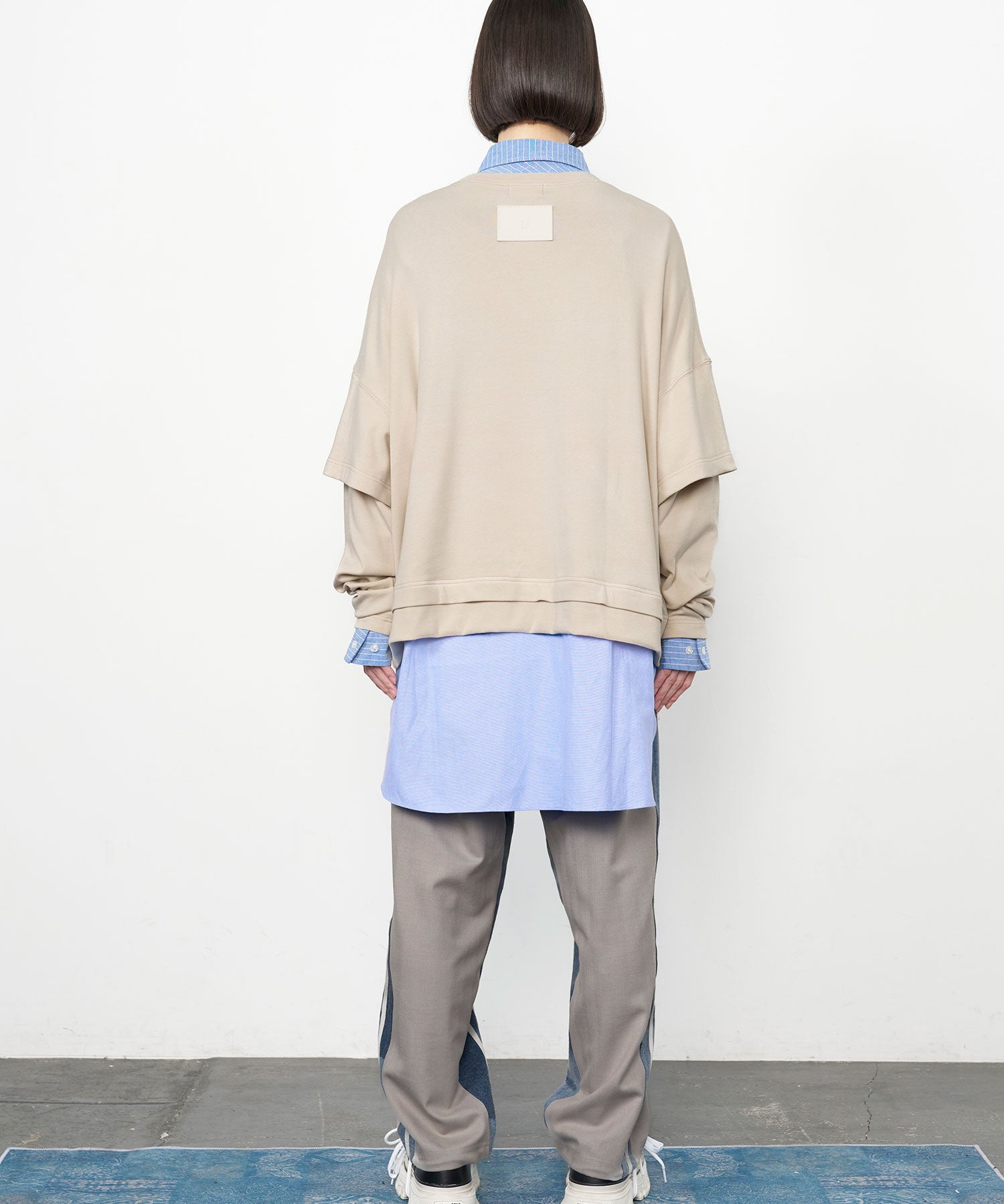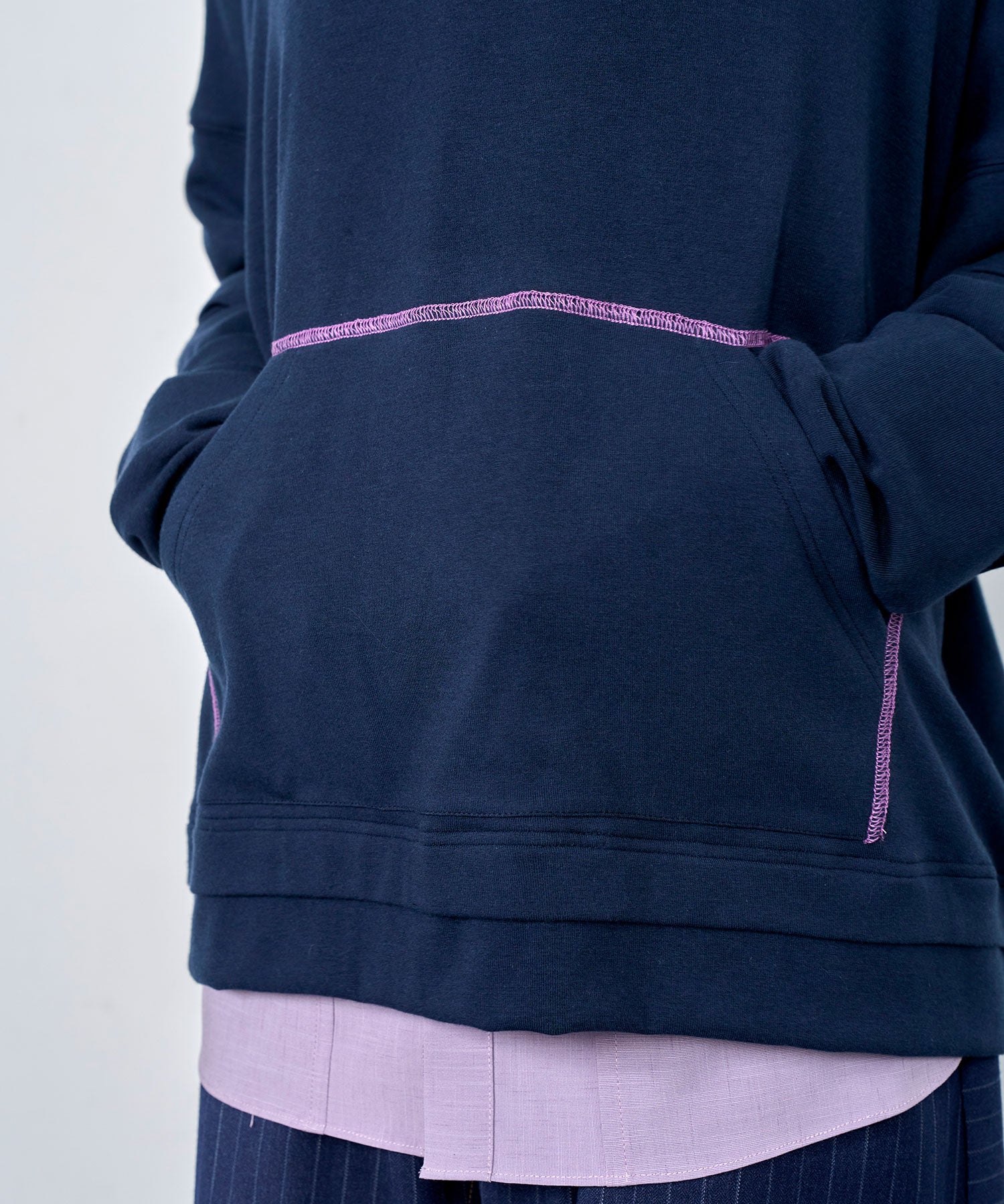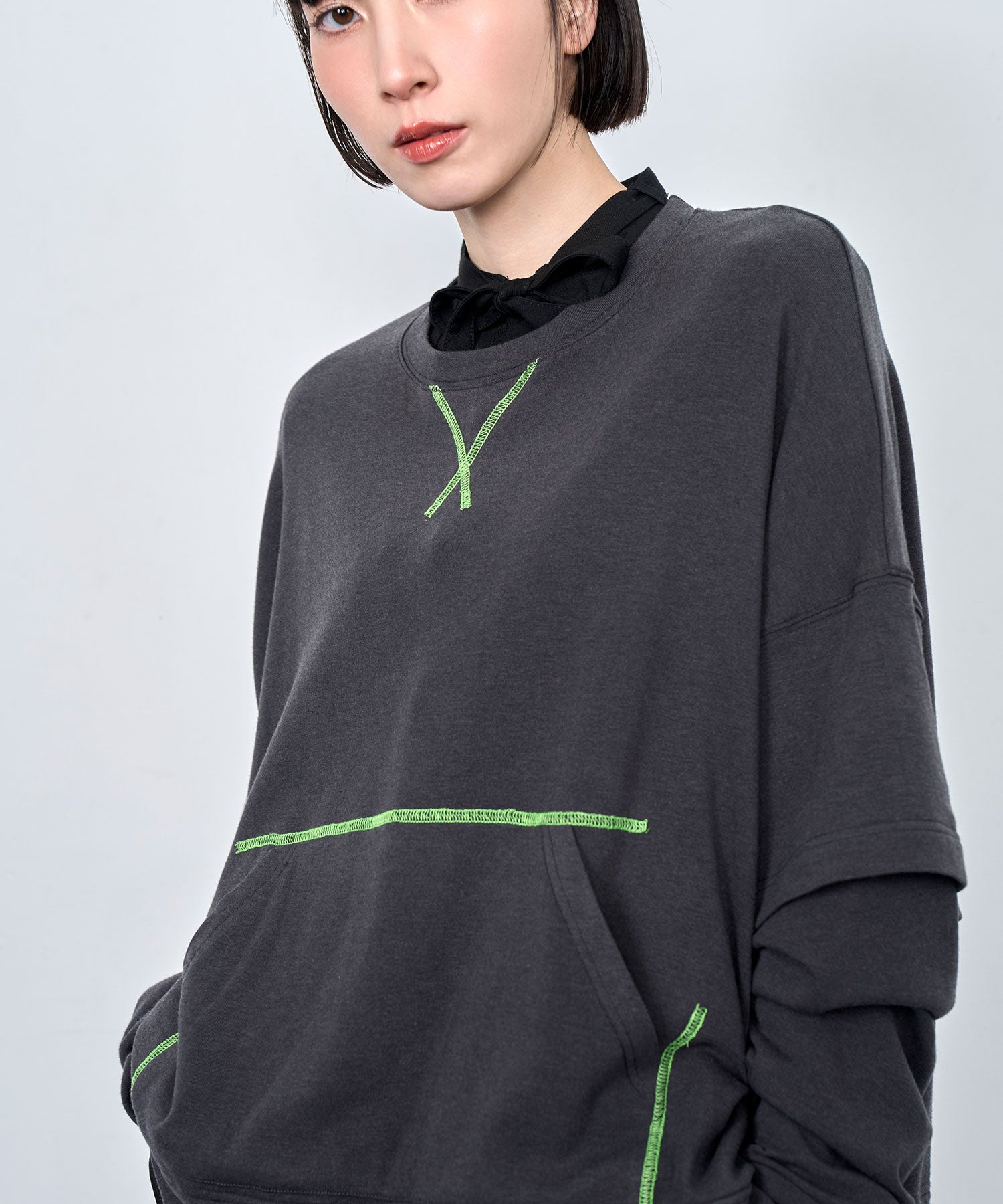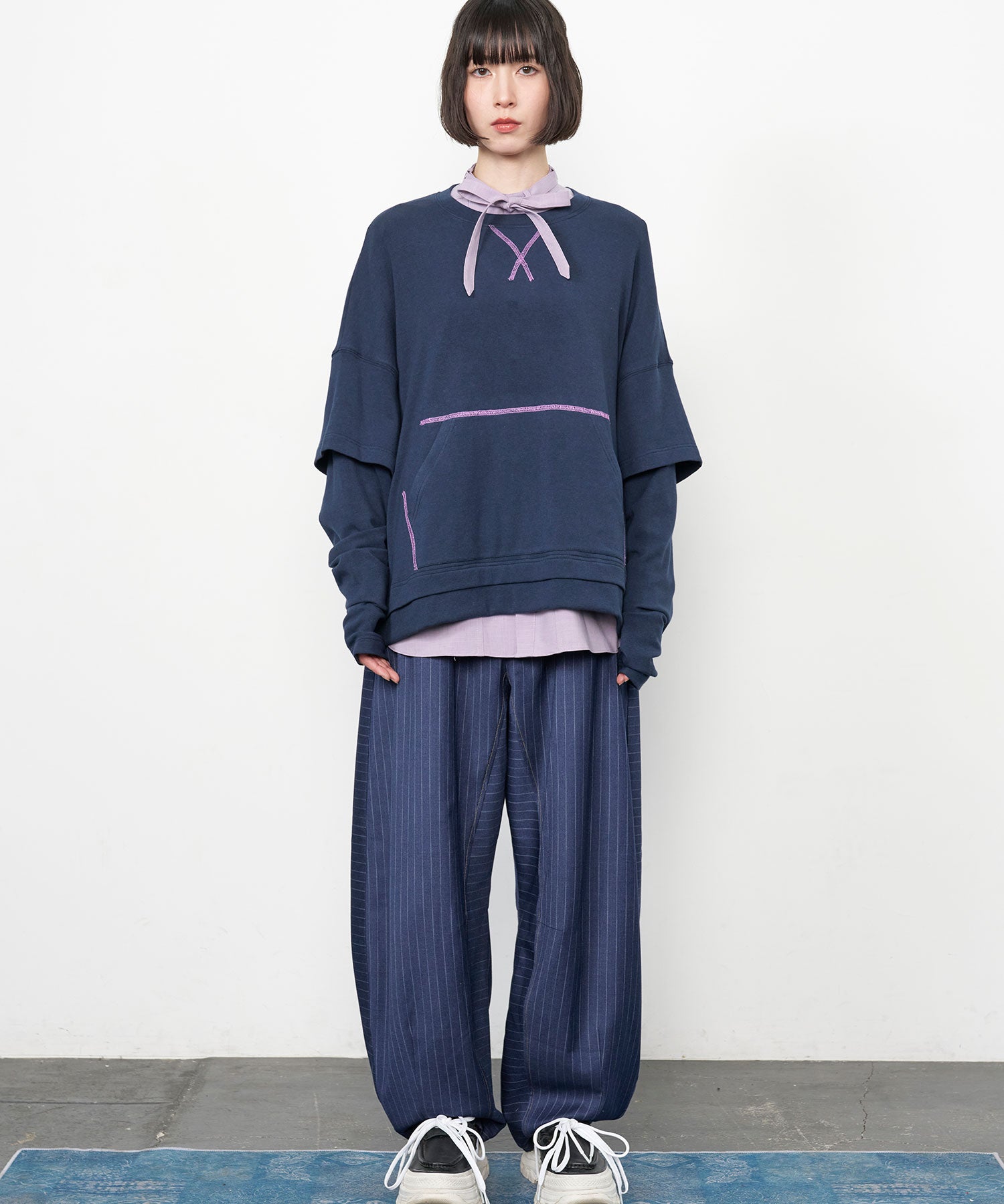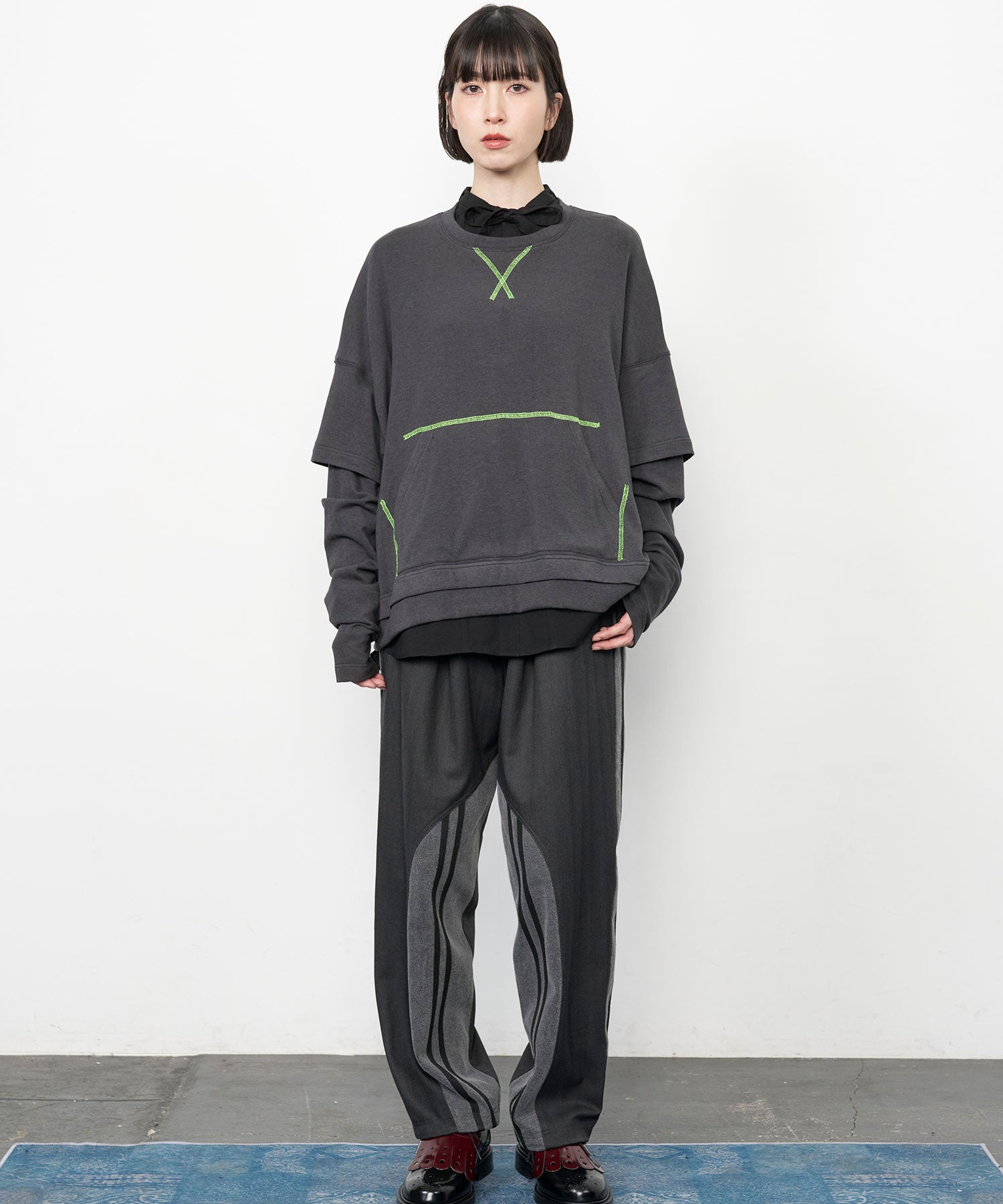配色ステッチがアクセントになった、レイヤード風デザインのロングスリーブTシャツ。