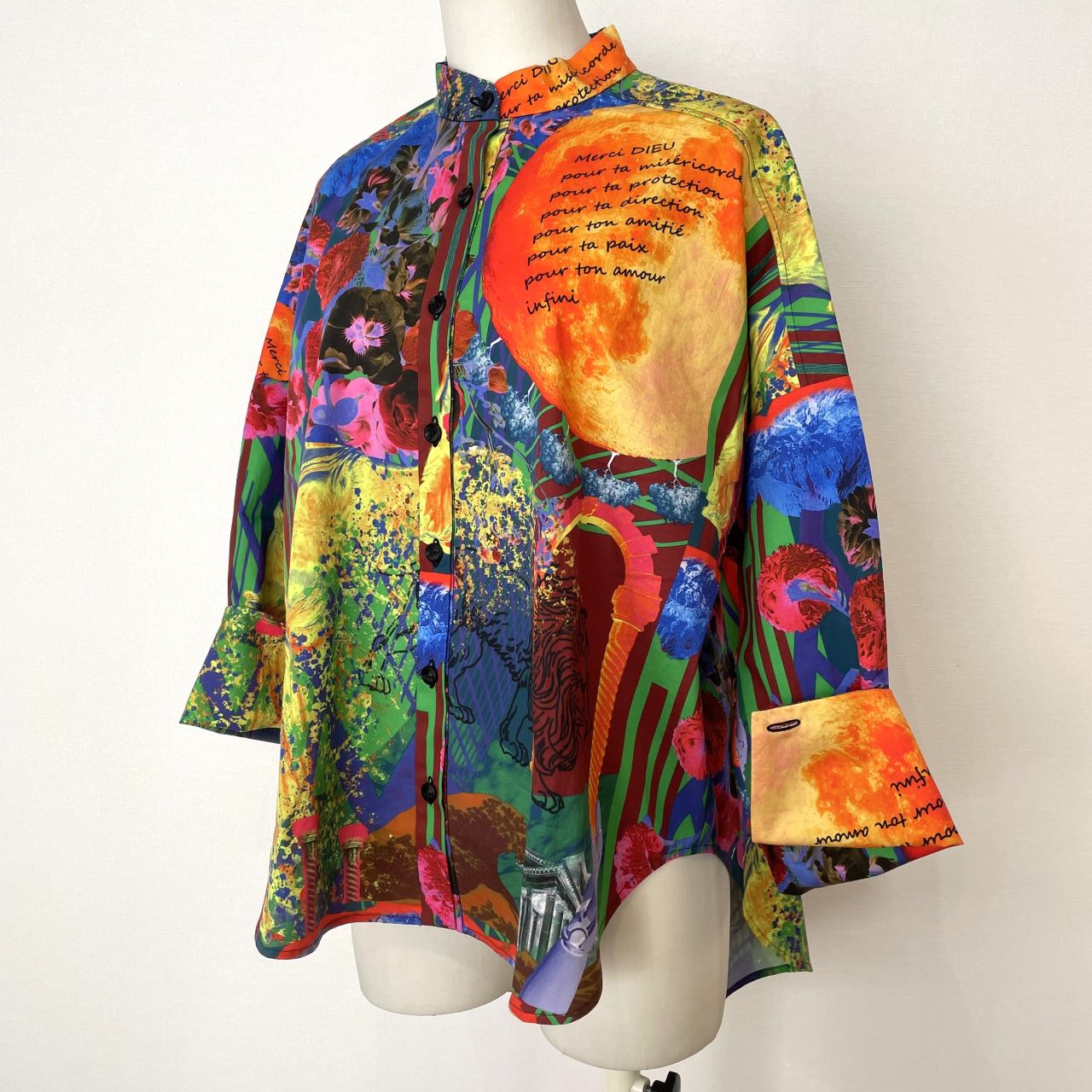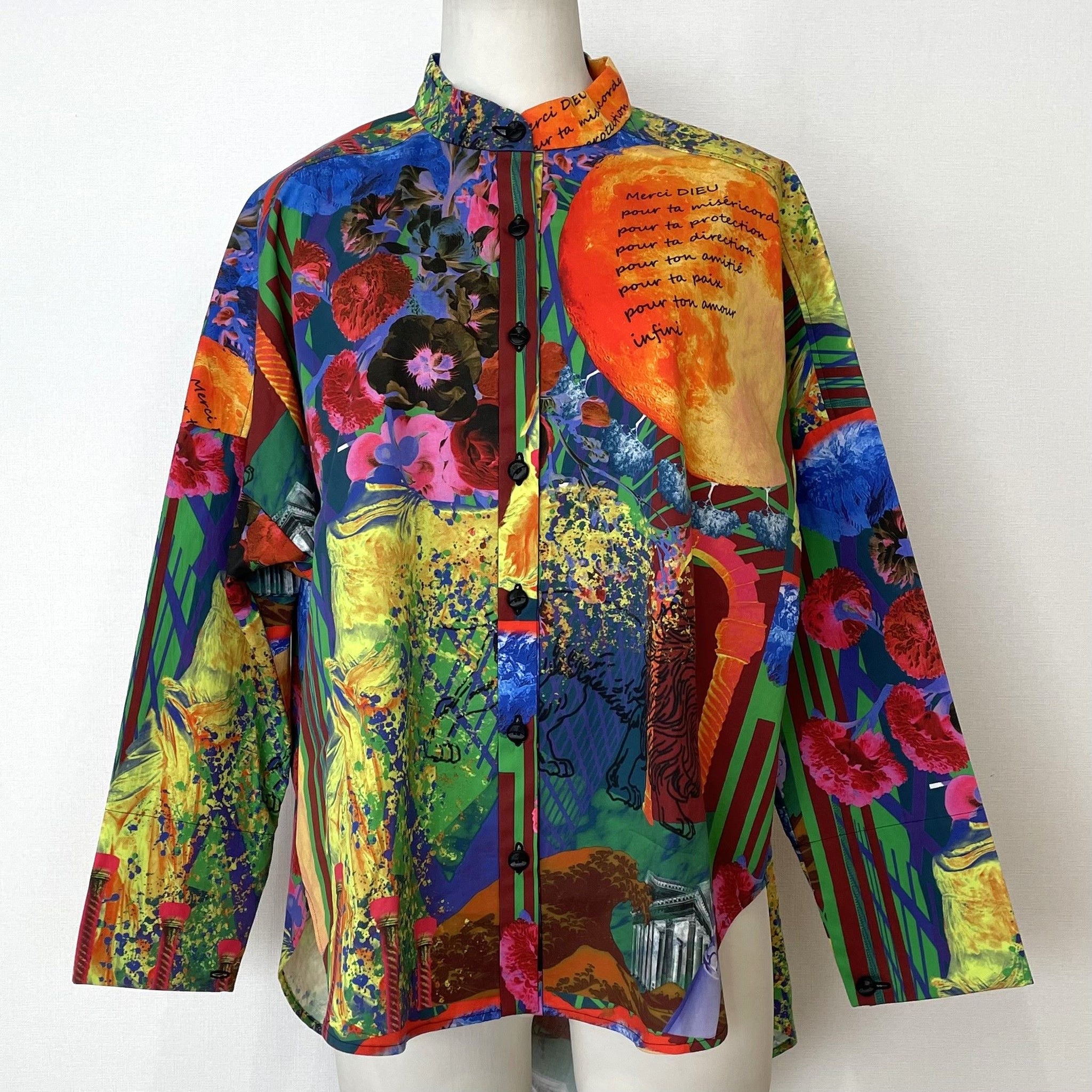 オリジナルのコラージュアートをプリントした生地で、型紙、縫製まですべての工程をデザイナー自身が行ったオリジナルのシャツです。