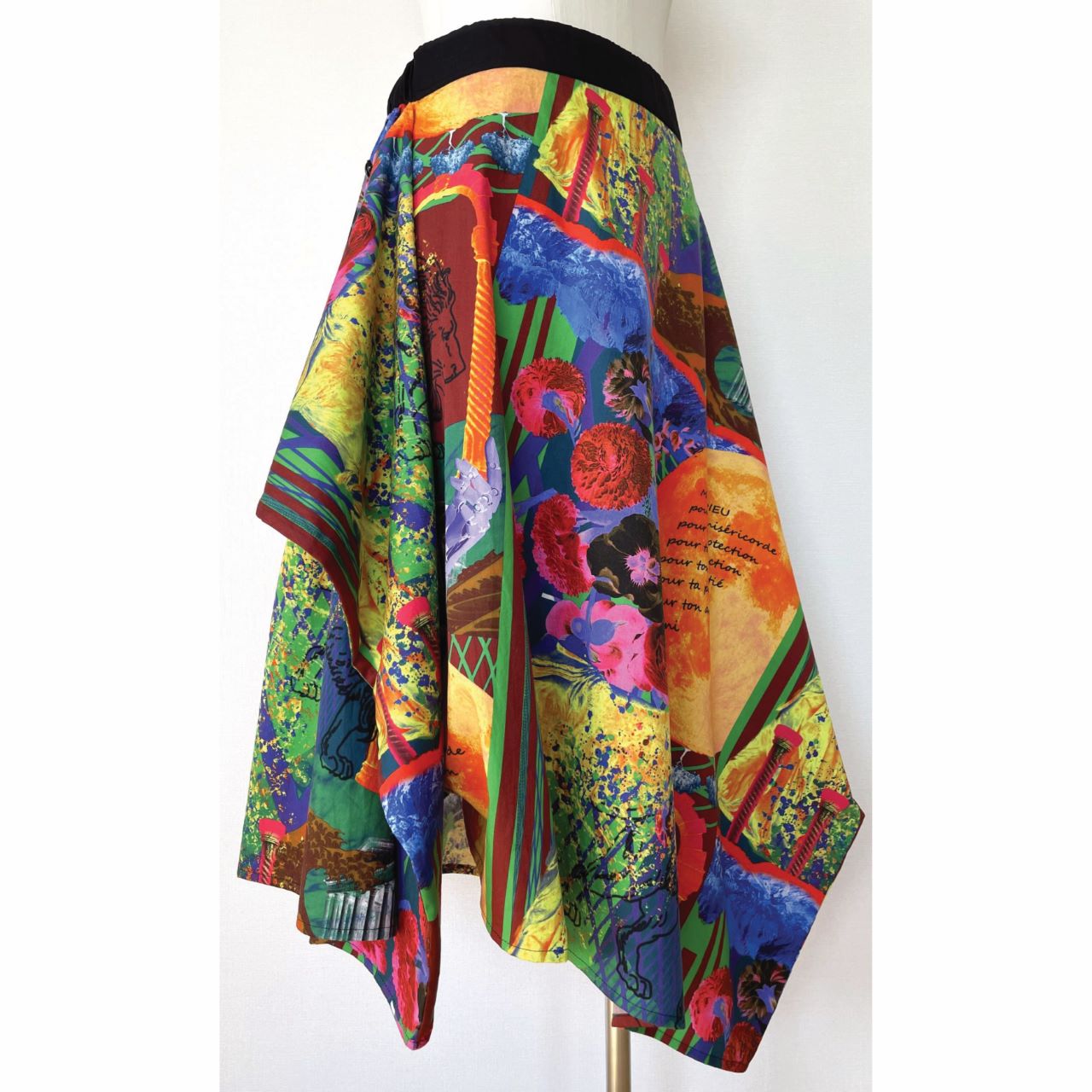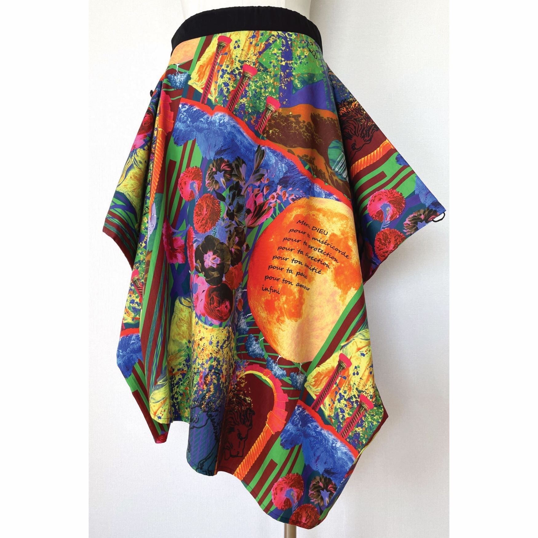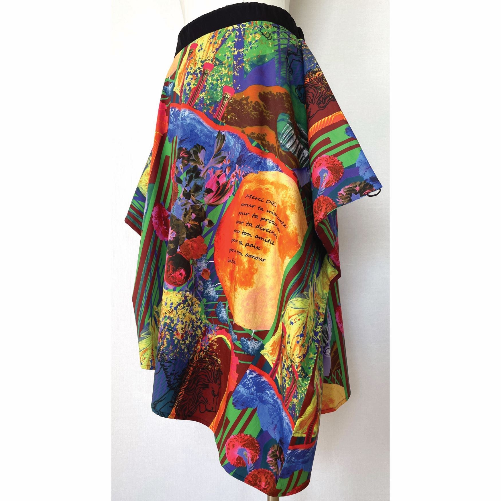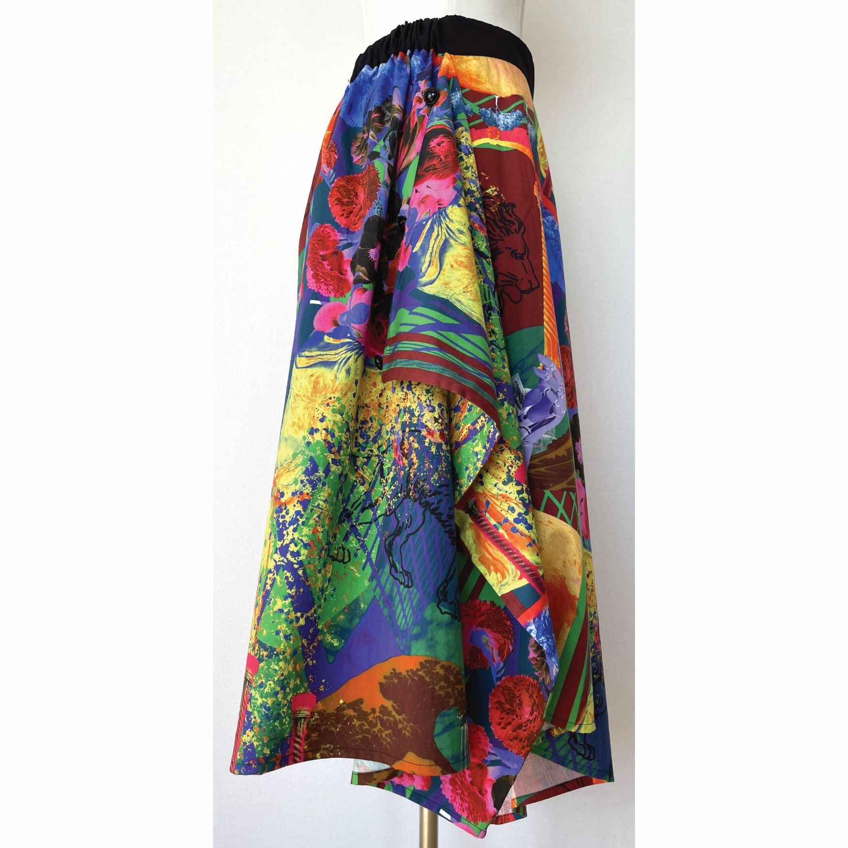 オリジナルのデジタルアートをプリントした生地で、デザイン、型紙、縫製まですべての工程をデザイナー自身が行いました。