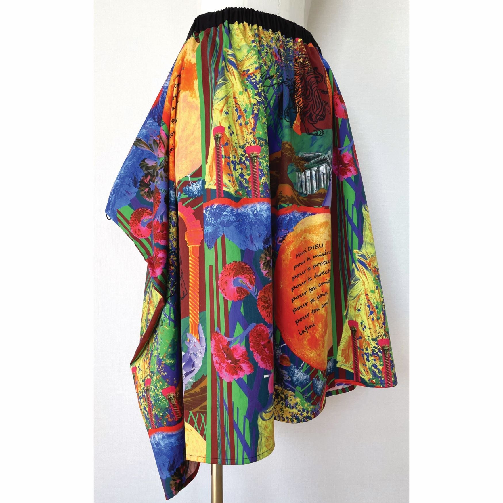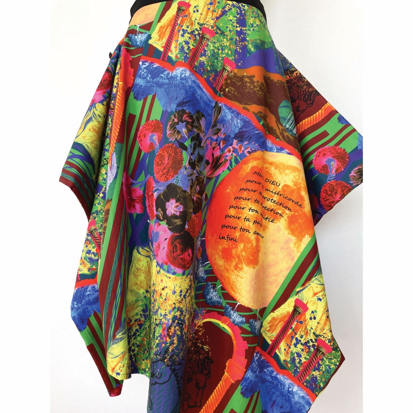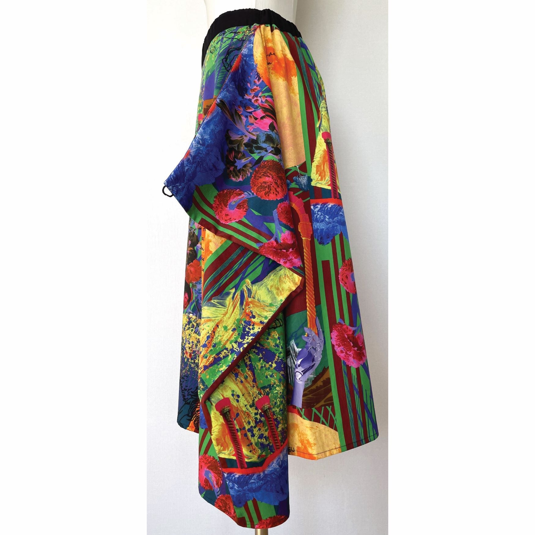 オリジナルのデジタルアートをプリントした生地で、デザイン、型紙、縫製まですべての工程をデザイナー自身が行いました。