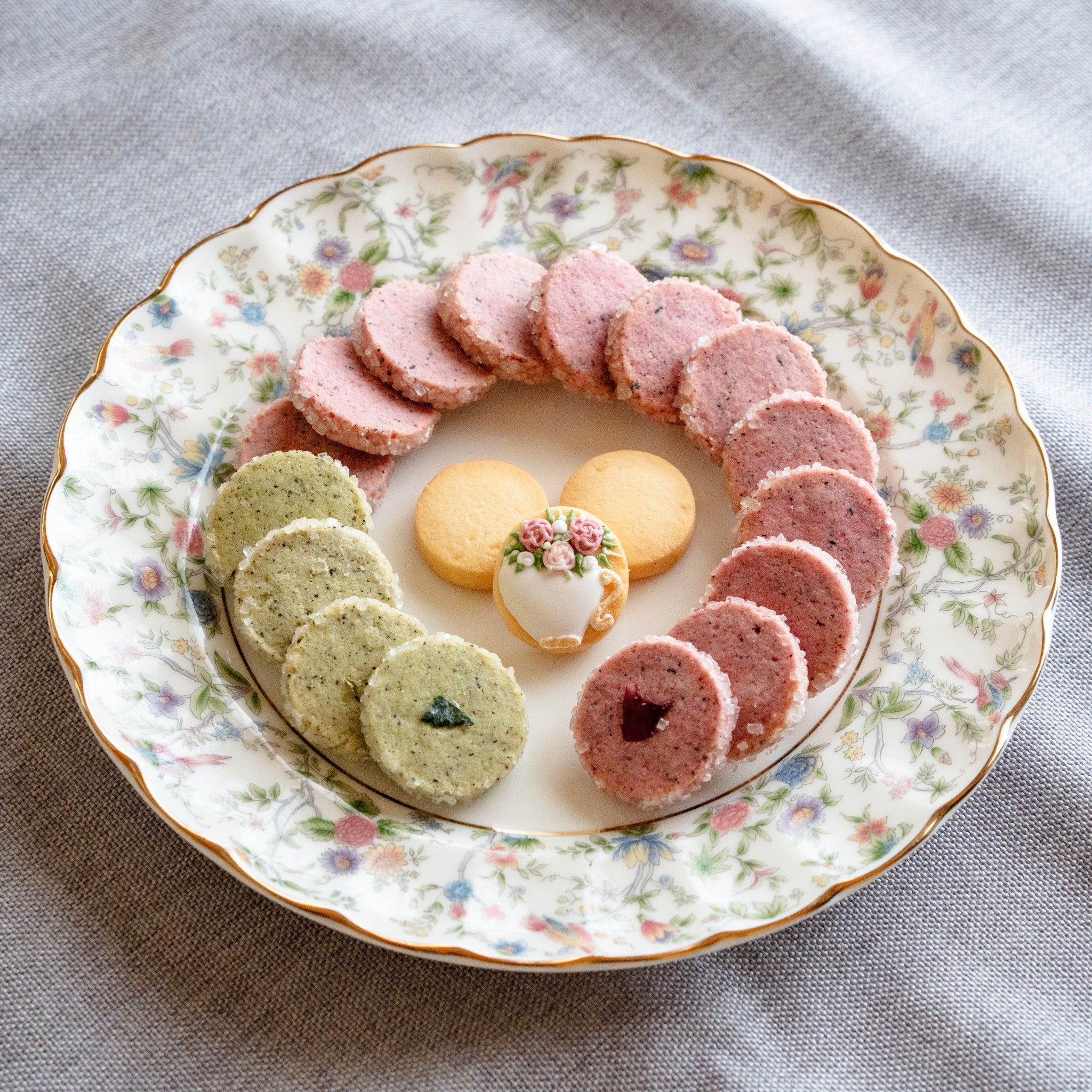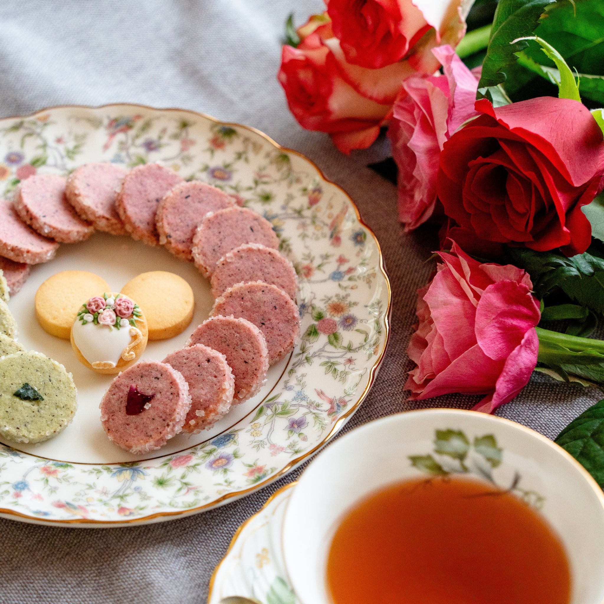 バラの香りのディアマンクッキーにローズペタルをトッピング。