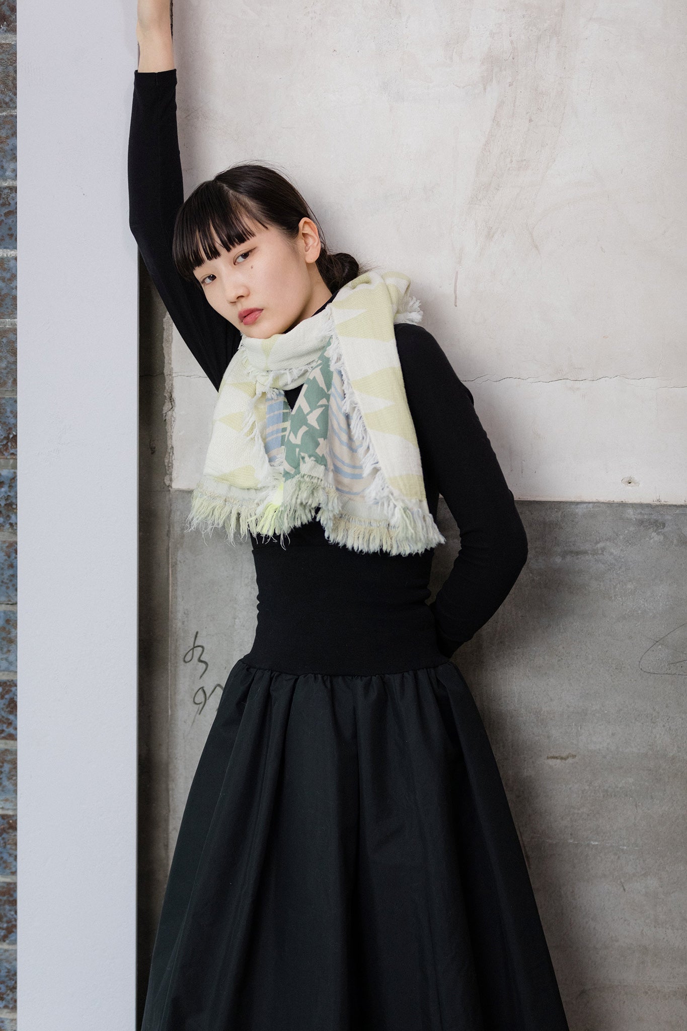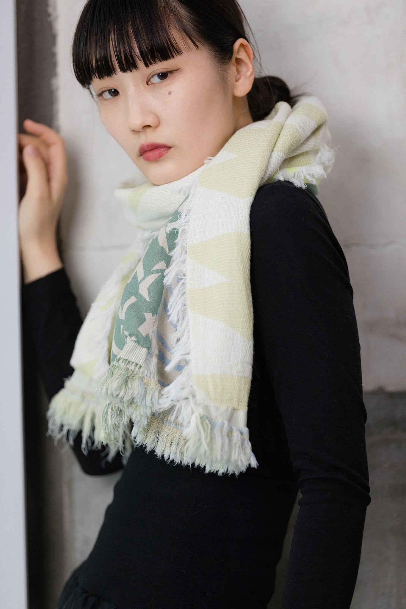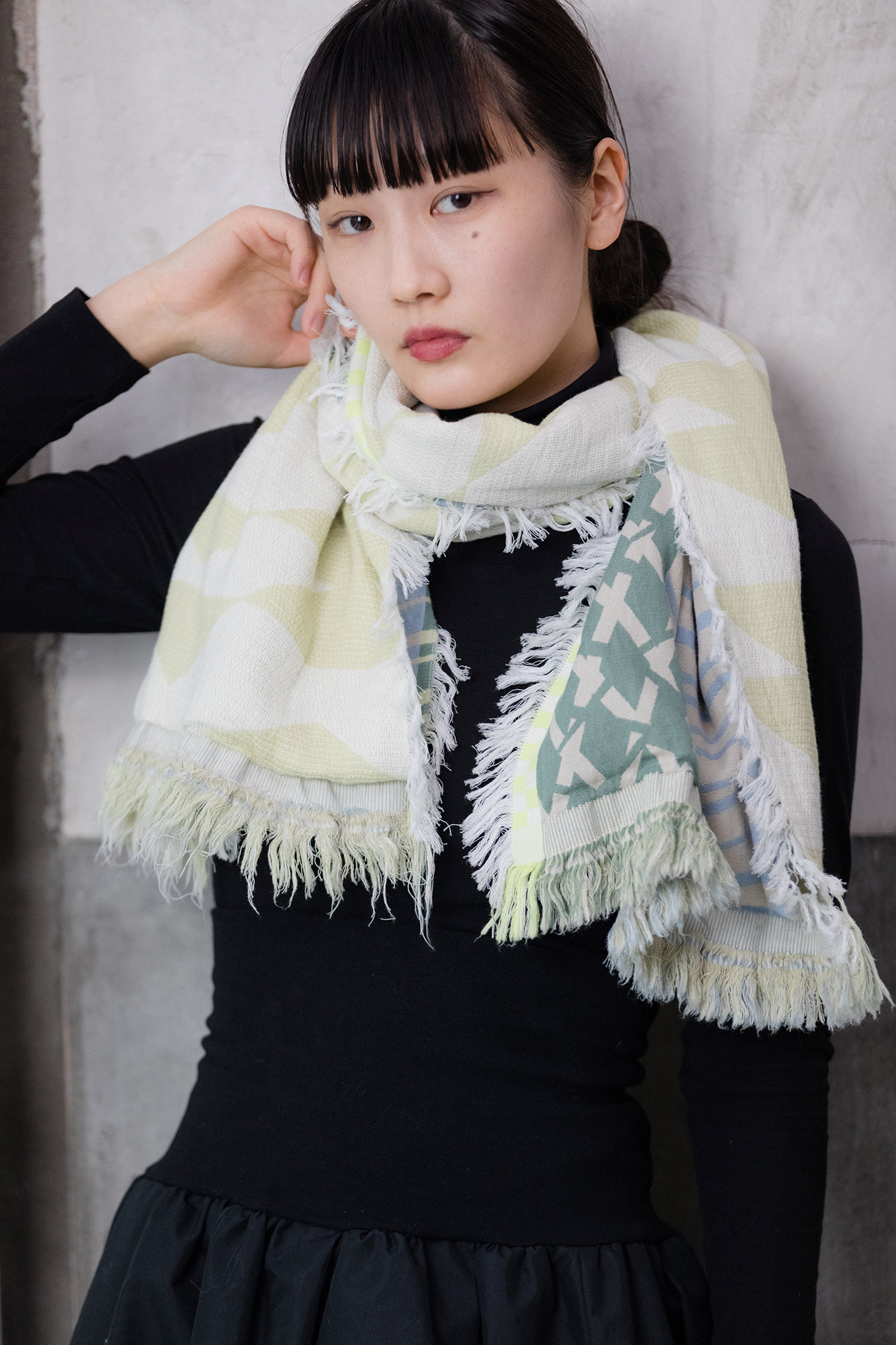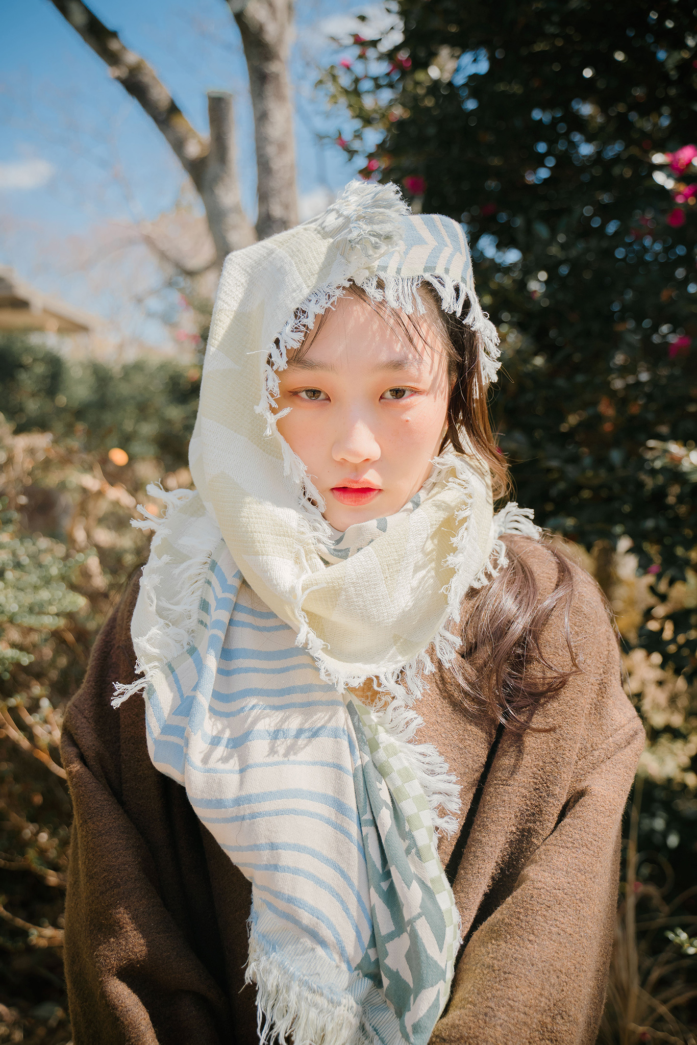 ストールの端を頭に被って”真知子巻き(まちこまき)”も。