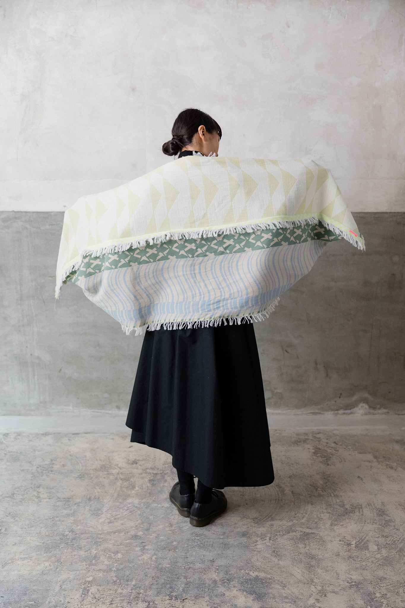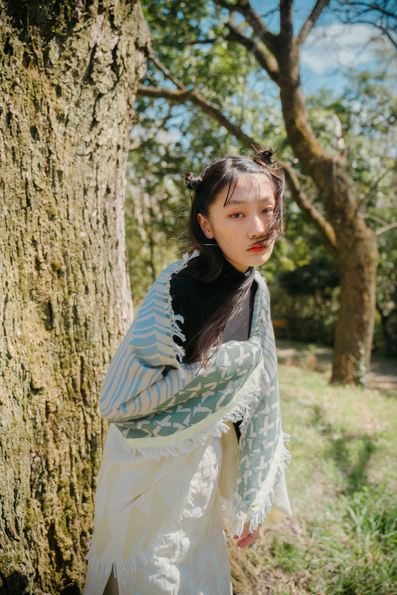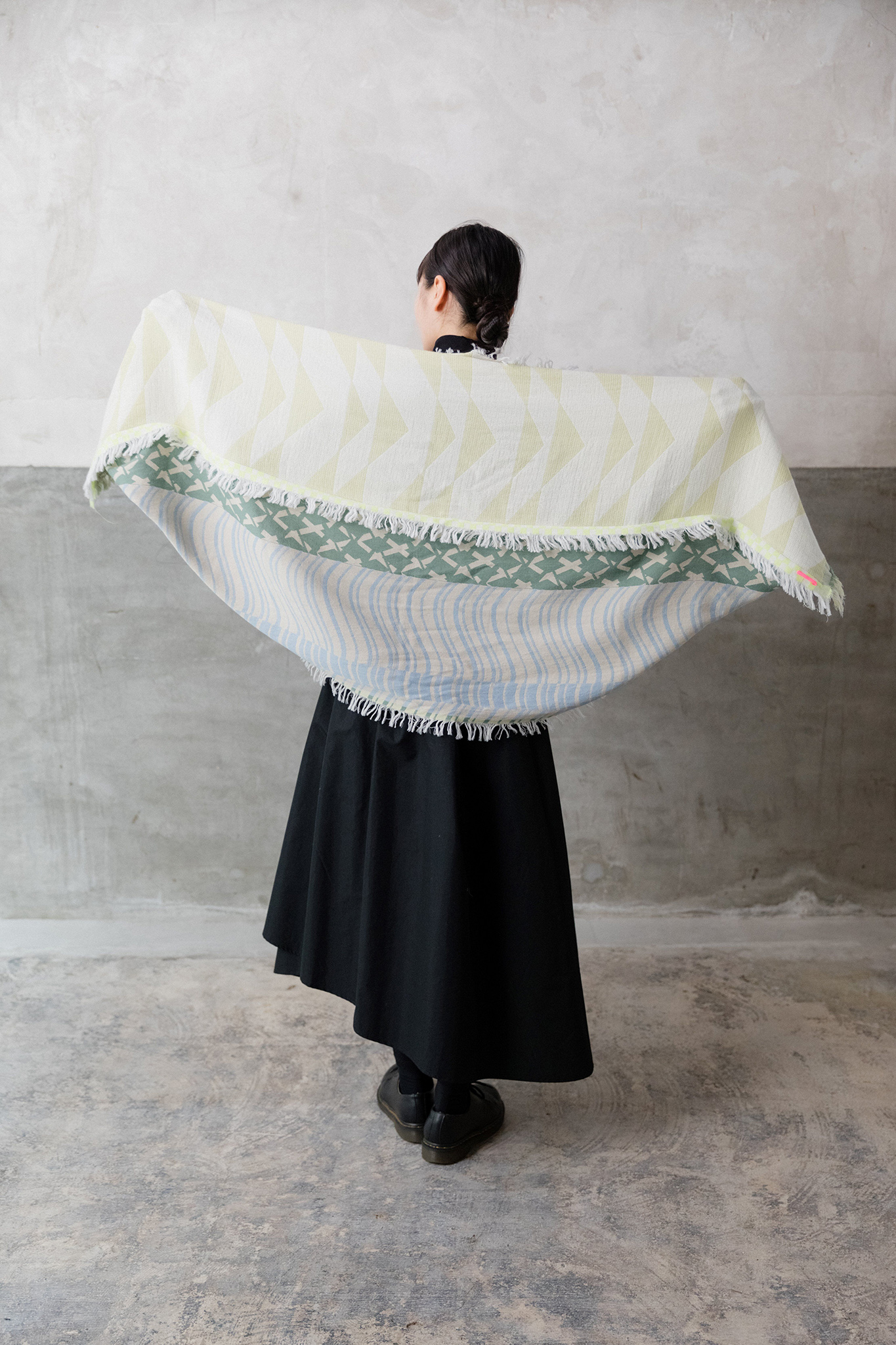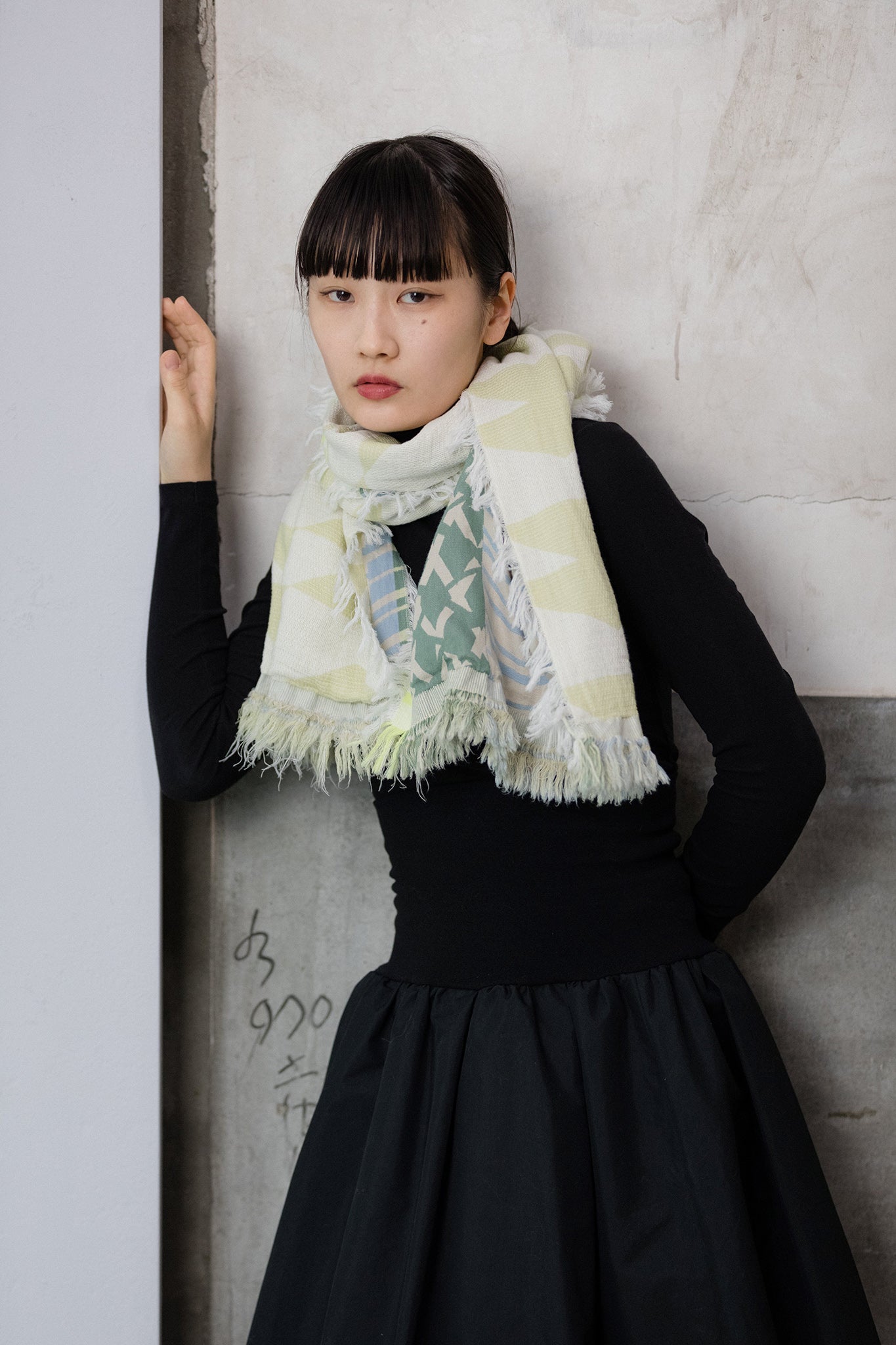 ストールの端を頭に被って”真知子巻き(まちこまき)”も。