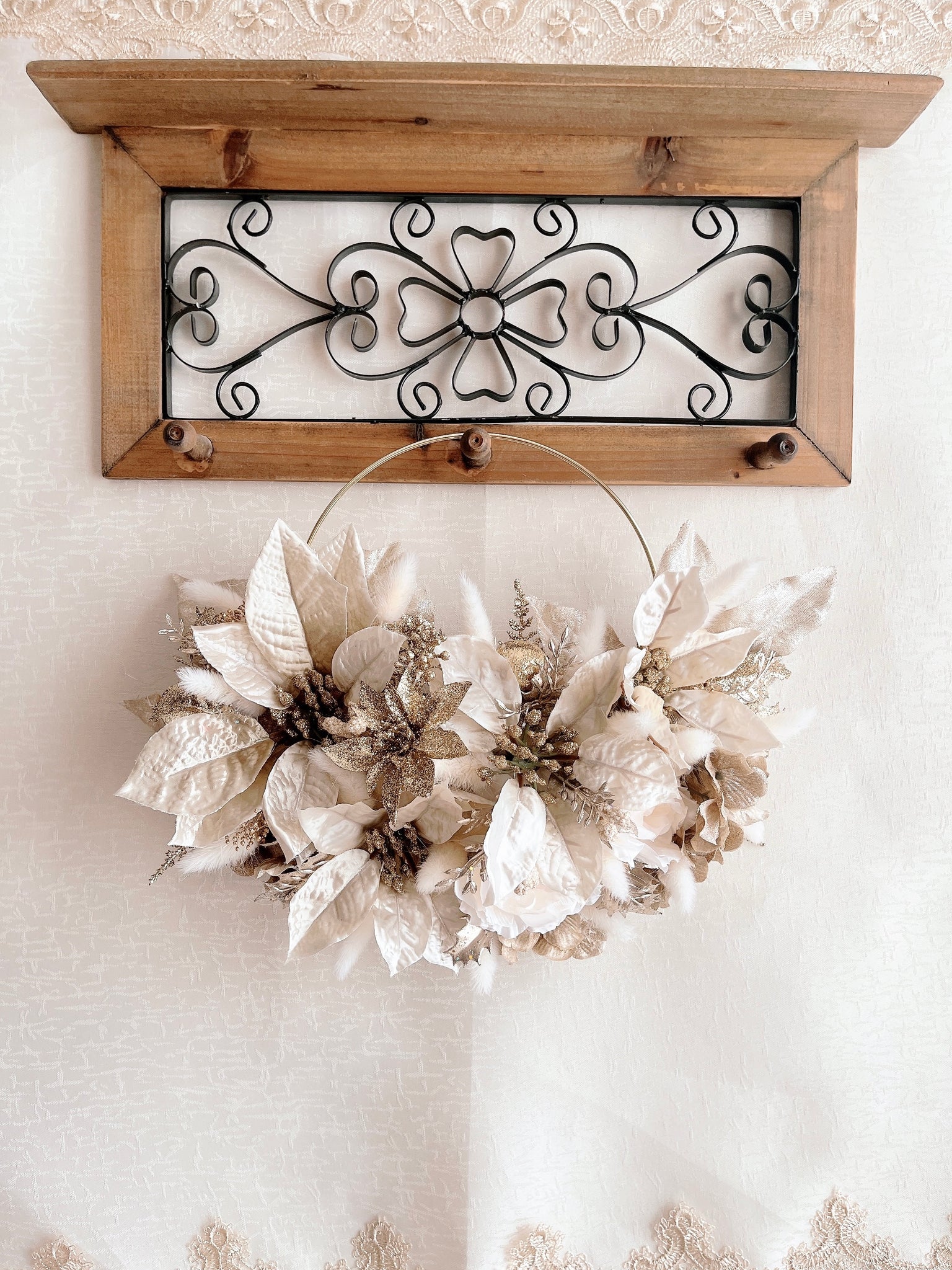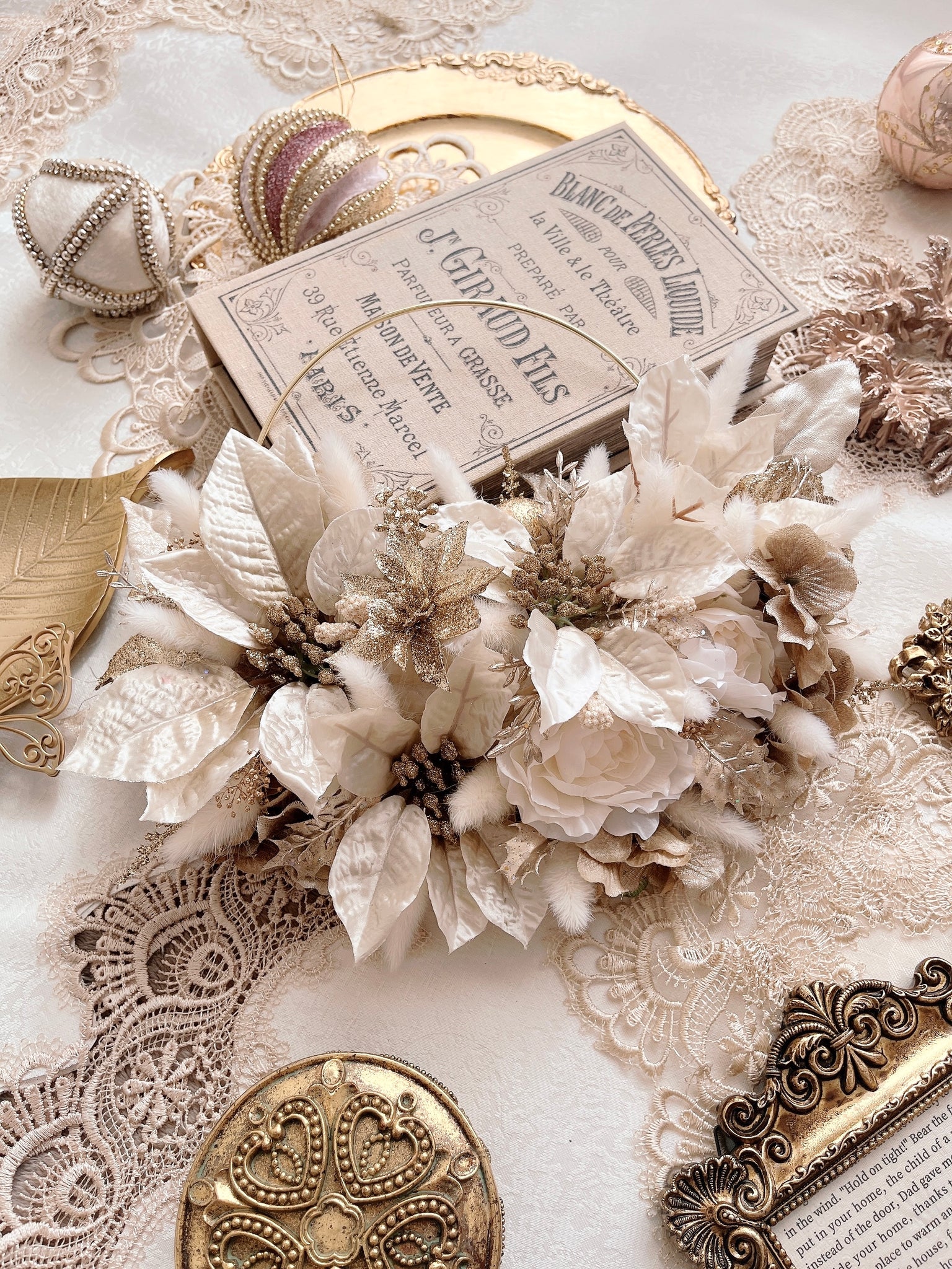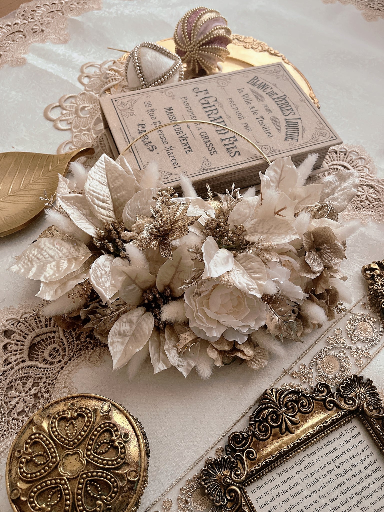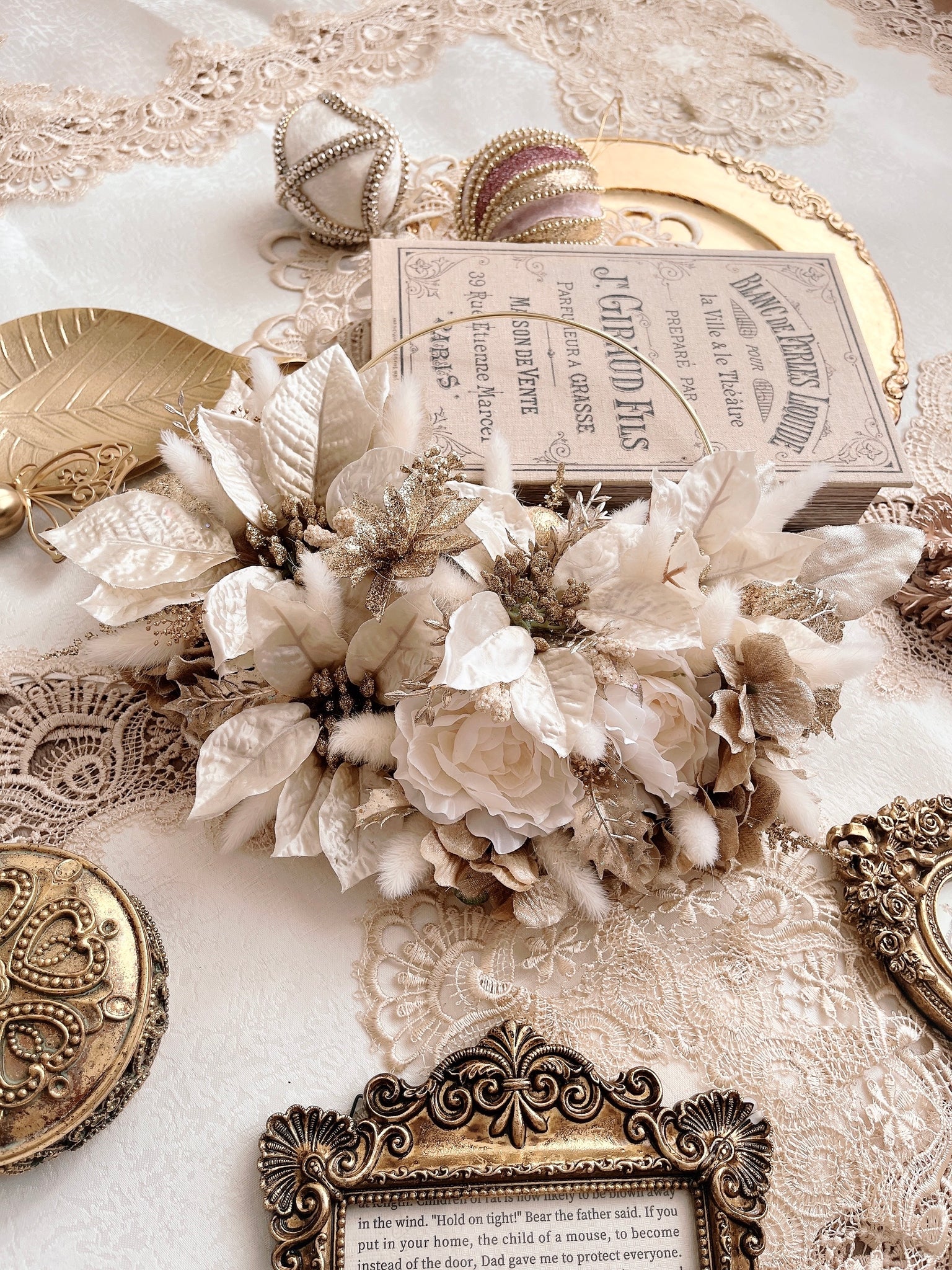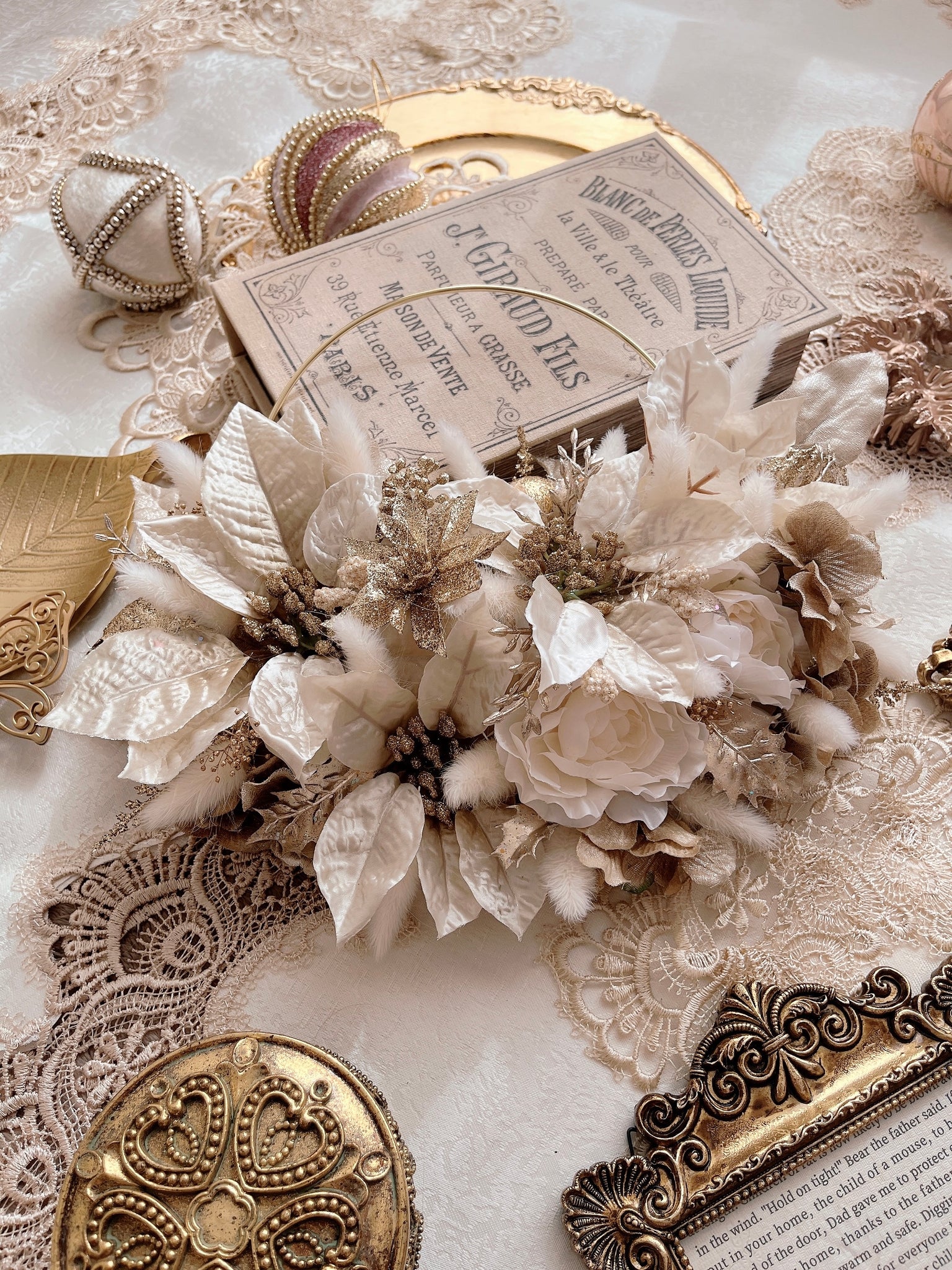 豪華な星のように輝くシャンパンゴールドと雪のように白く上品なループ型のホワイトクリスマスリースです。特別な日のしっとりした大人のクリスマスを。シーズン問わず飾っていただくこともできます。