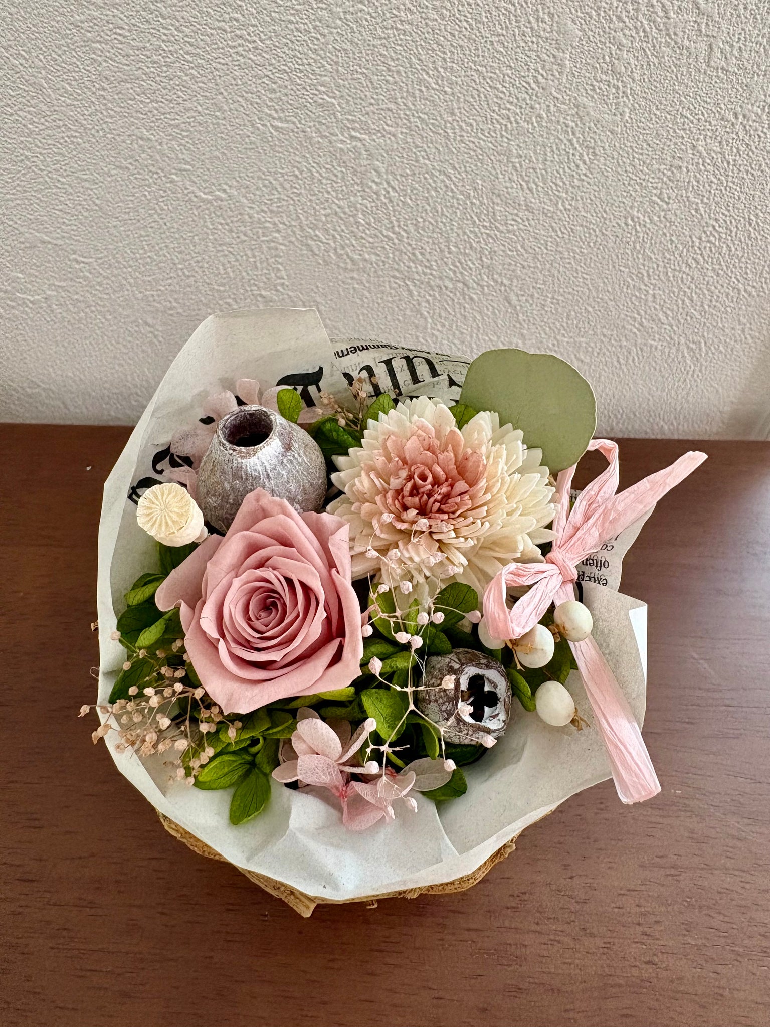 その他は天然素材 ・器…籠・サイズ…直径約10㎝、高さ約13㎝プリザーブドフラワーお手入れの注意点•水やりの必要はありません。•色落ち等の原因になりますので高温、多湿を避けてください。•色あせ等の原因になりますので直射日光を避けてください。•花びらは切れやすいのでご注意ください。梱包には万全を期しておりますが大変繊細な作品ですので、配送時の葉こぼれなどはご容赦いただけますようにお願いいたします。
