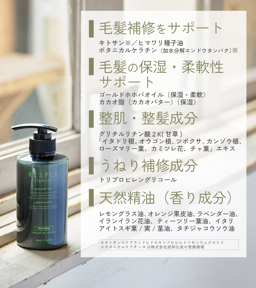 □RESPLE organics シャワーブラシを併用することで、トリートメントの浸透率を上げ、ハリコシツヤのある美しい髪へと導きます。