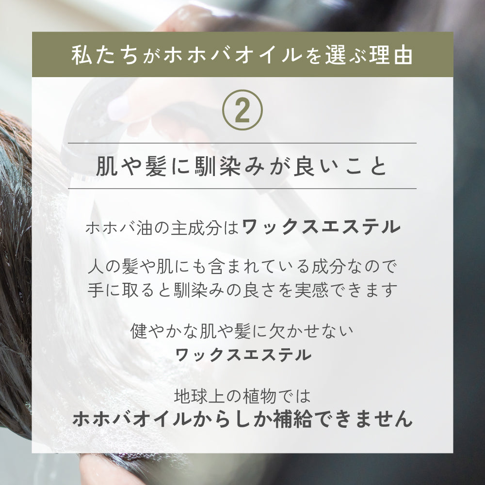 ●年齢とともに減少する「ワックスエステル」を補給するため「ホホバオイル」を無農薬で栽培し、有機認証取得の「Jojoba Seed Oil Gold」を使用。