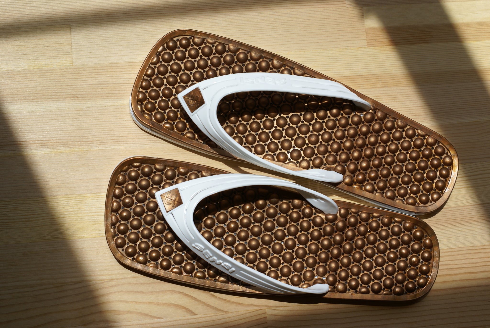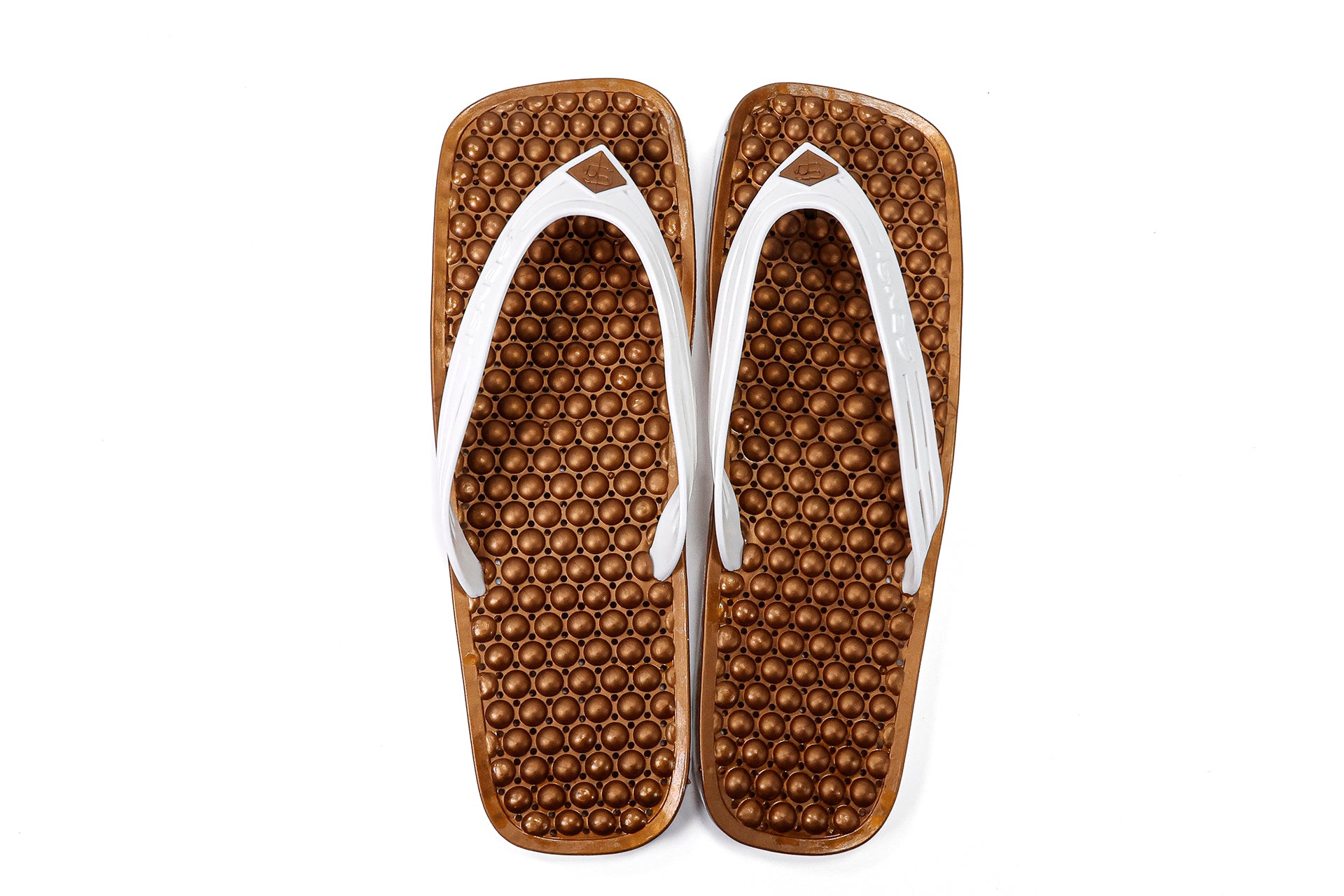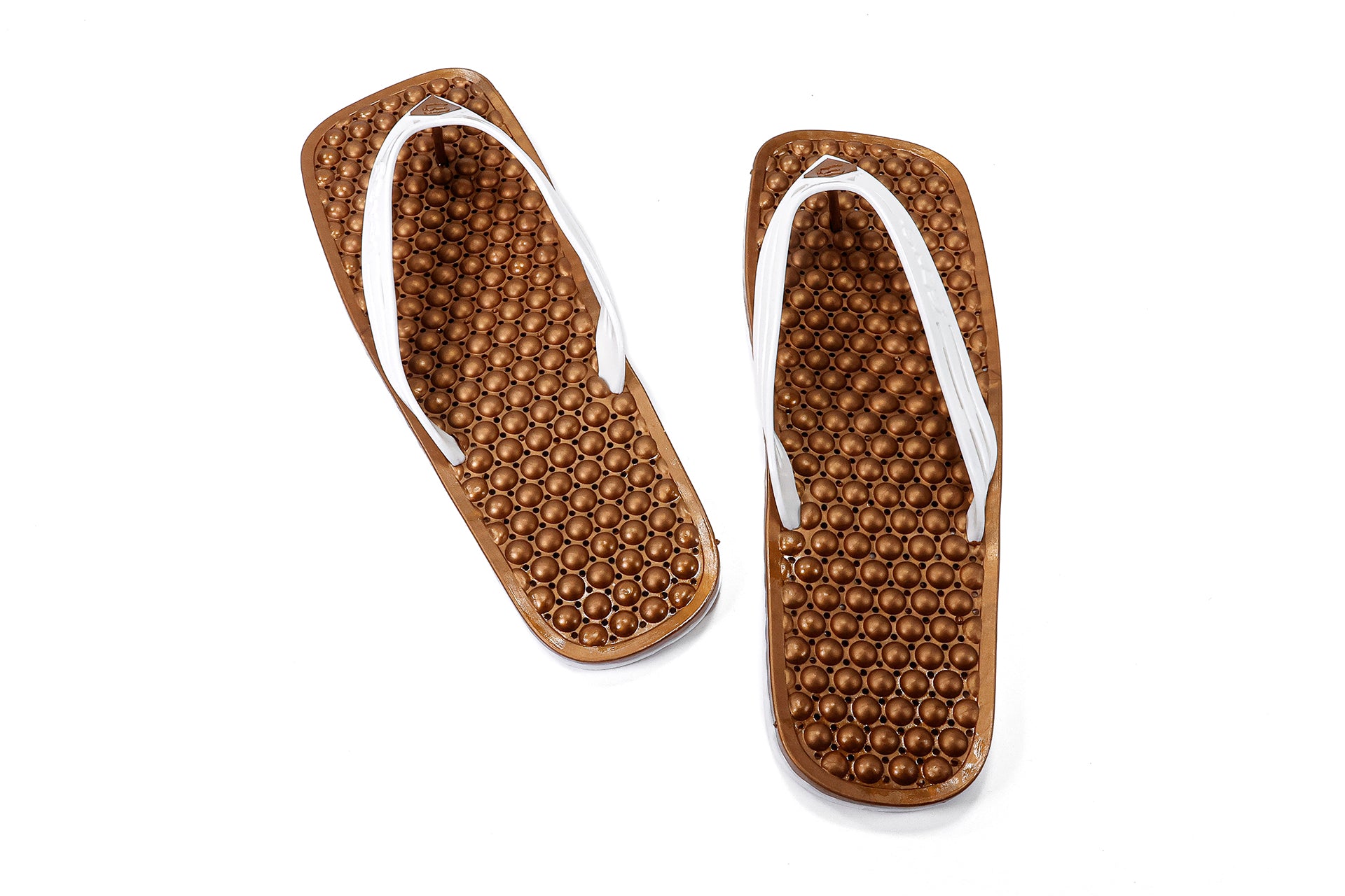 フットベッド(足をのせる面)に半球状のデコボコの突起が付いています。 これが足裏に適度な刺激となり、マッサージや血行促進の効果があります。また歩くときには衝撃吸収の効果もあります。