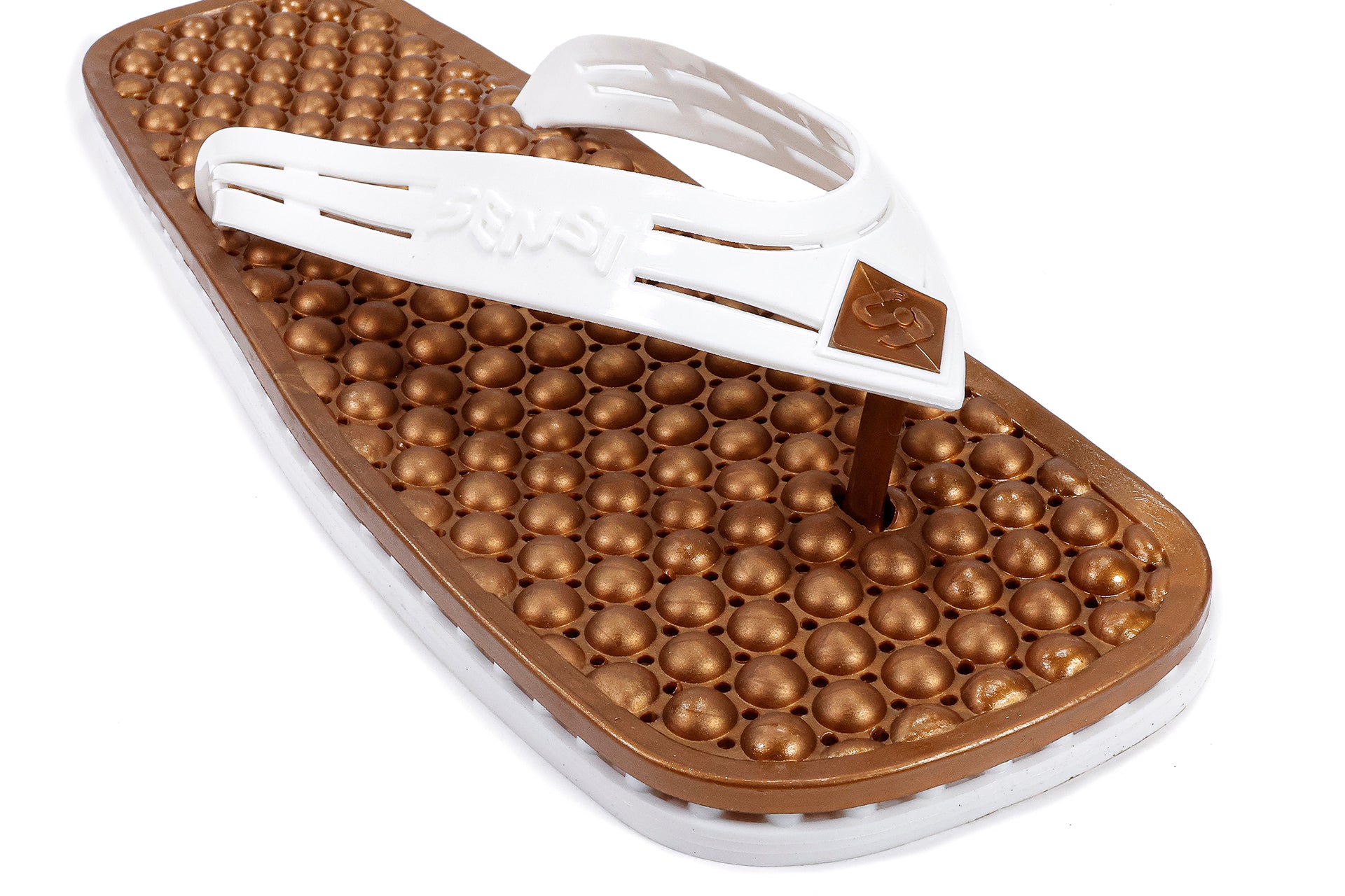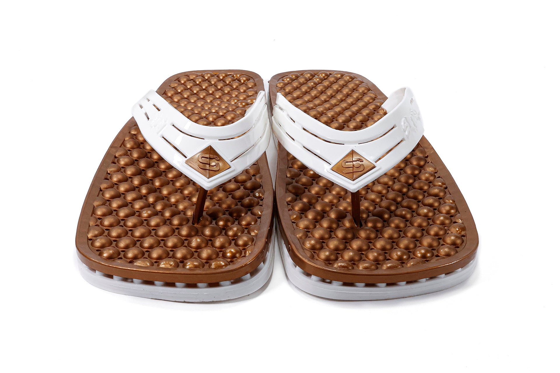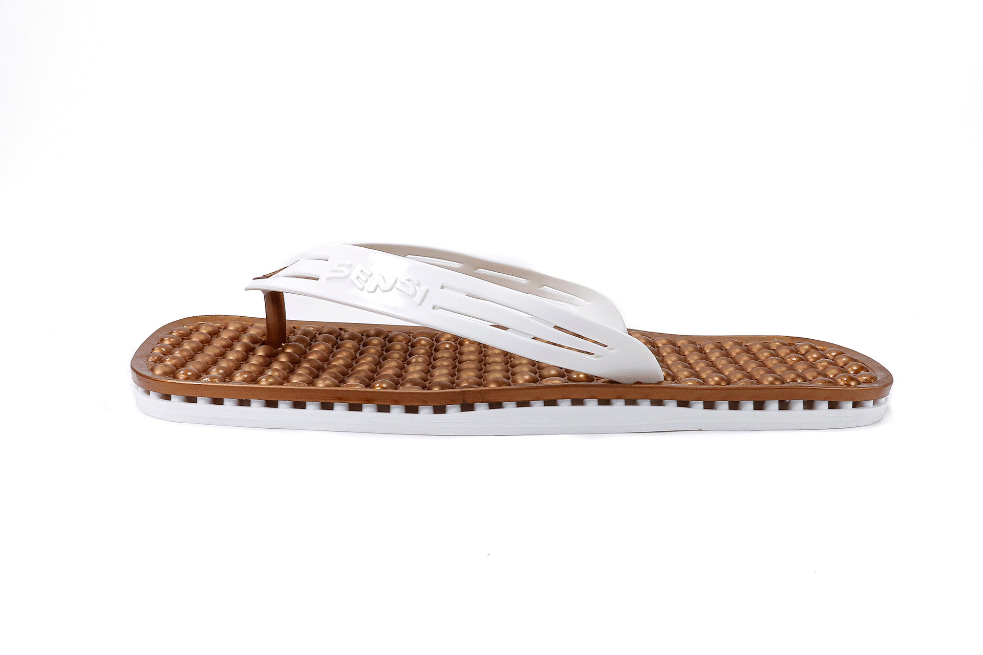 フットベッド(足をのせる面)に半球状のデコボコの突起が付いています。 これが足裏に適度な刺激となり、マッサージや血行促進の効果があります。また歩くときには衝撃吸収の効果もあります。