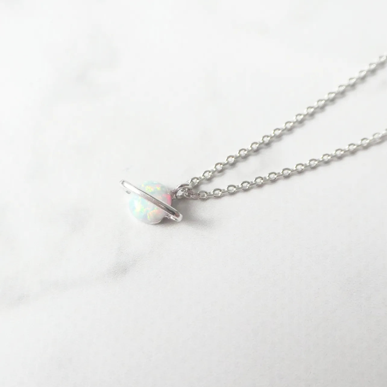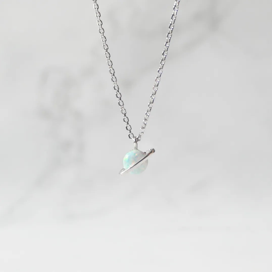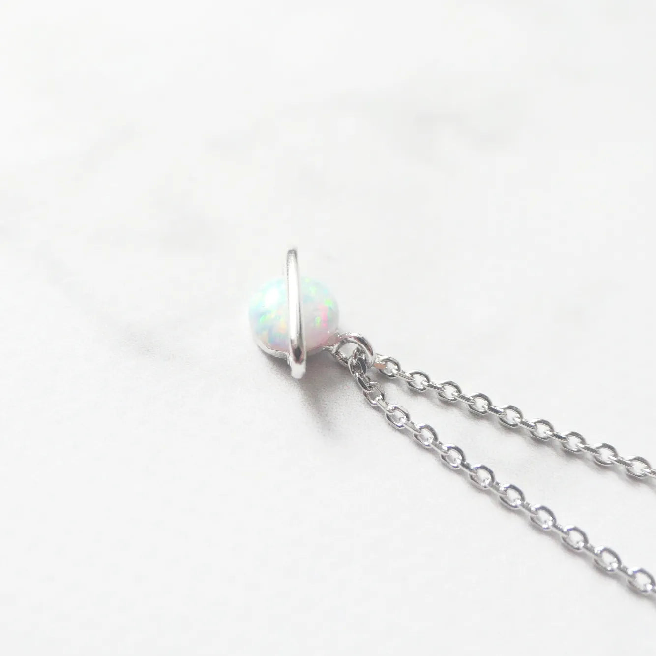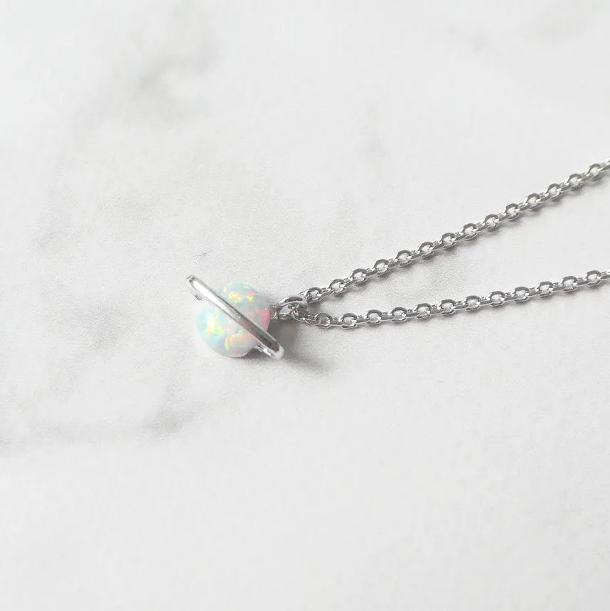 虹色の遊色効果をもつ天然オパールを惑星モチーフにセットしたシルバーネックレス。
