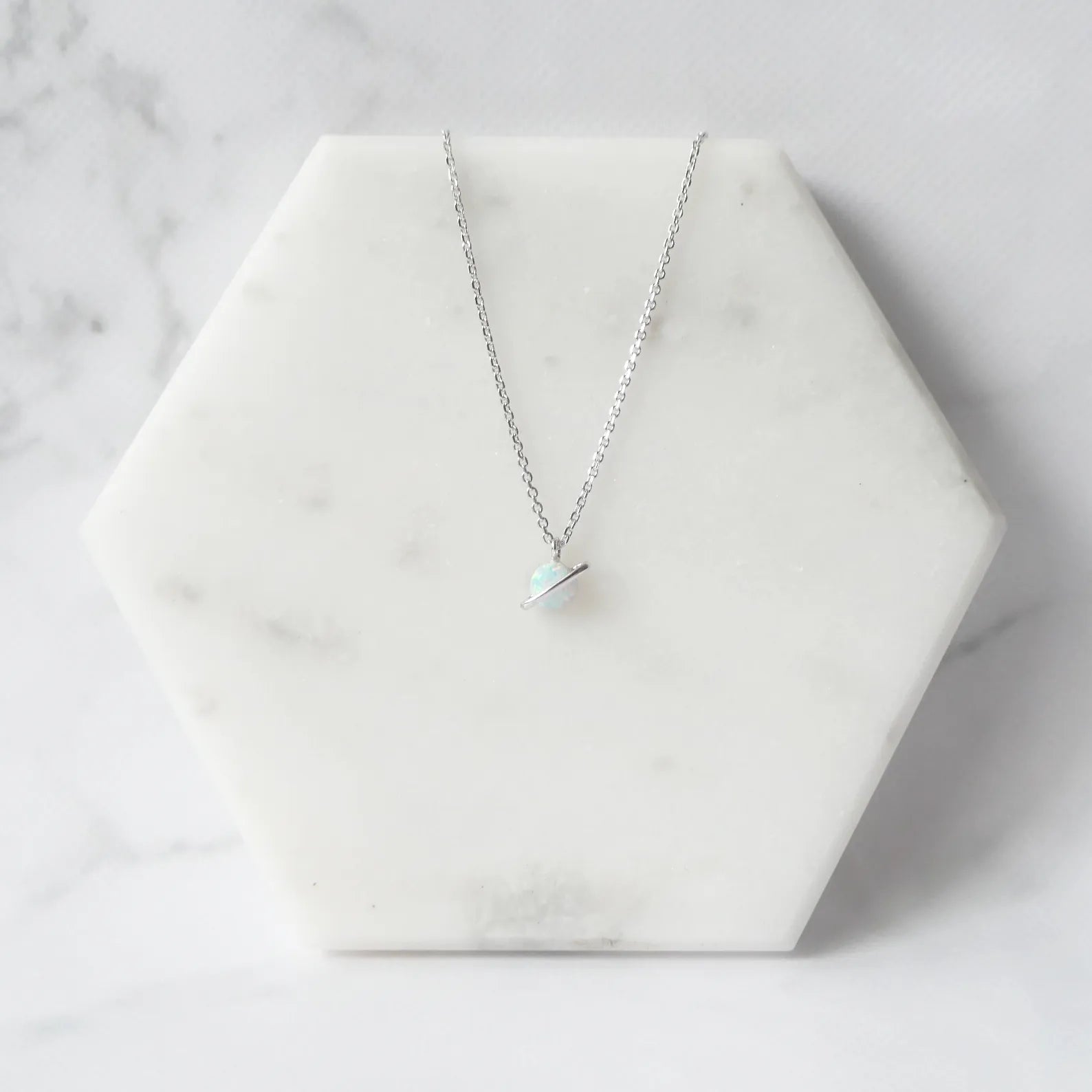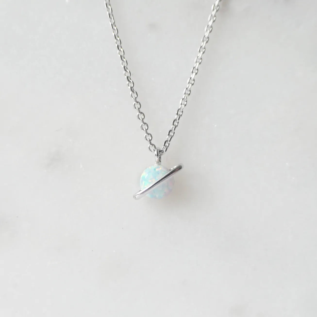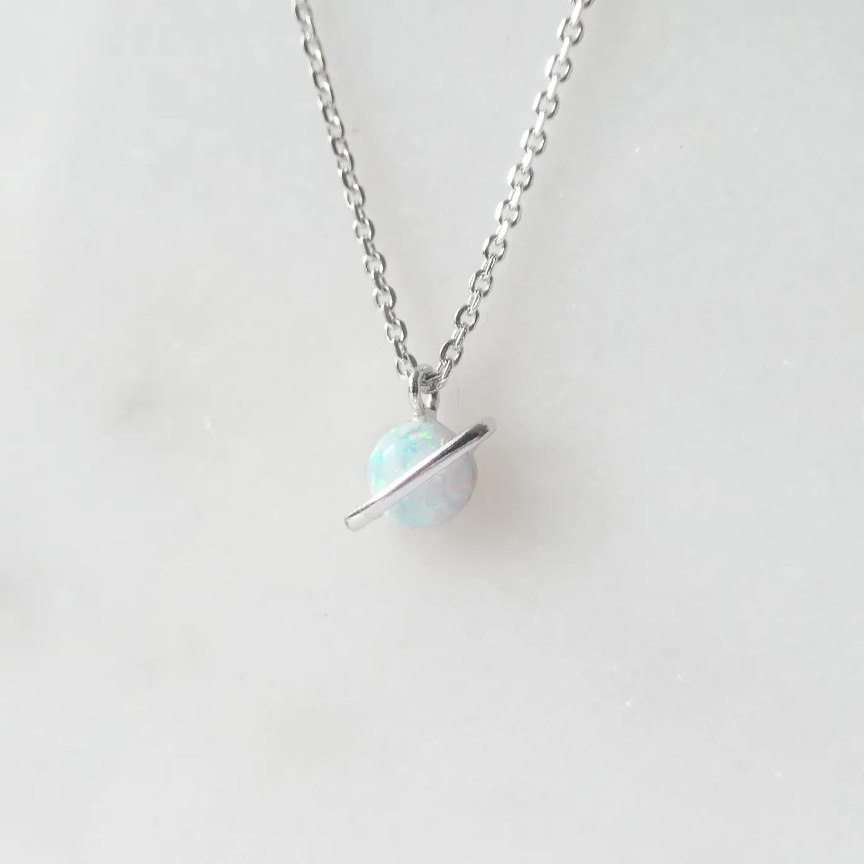 虹色の遊色効果をもつ天然オパールを惑星モチーフにセットしたシルバーネックレス。