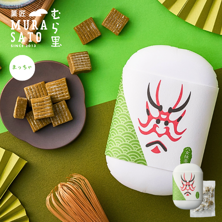 歌舞伎座や博多座でも人気の菓匠むら里の半生キャラメル。やわらかい食感にこだわり続けた半生キャラメルに福岡県八女市の”八女抹茶”の粉末を加えた風味ゆたかなキャラメルです。隈取りの箱に入れてお届けしますのでプチギフトやカジュアルギフトにおすすめです。