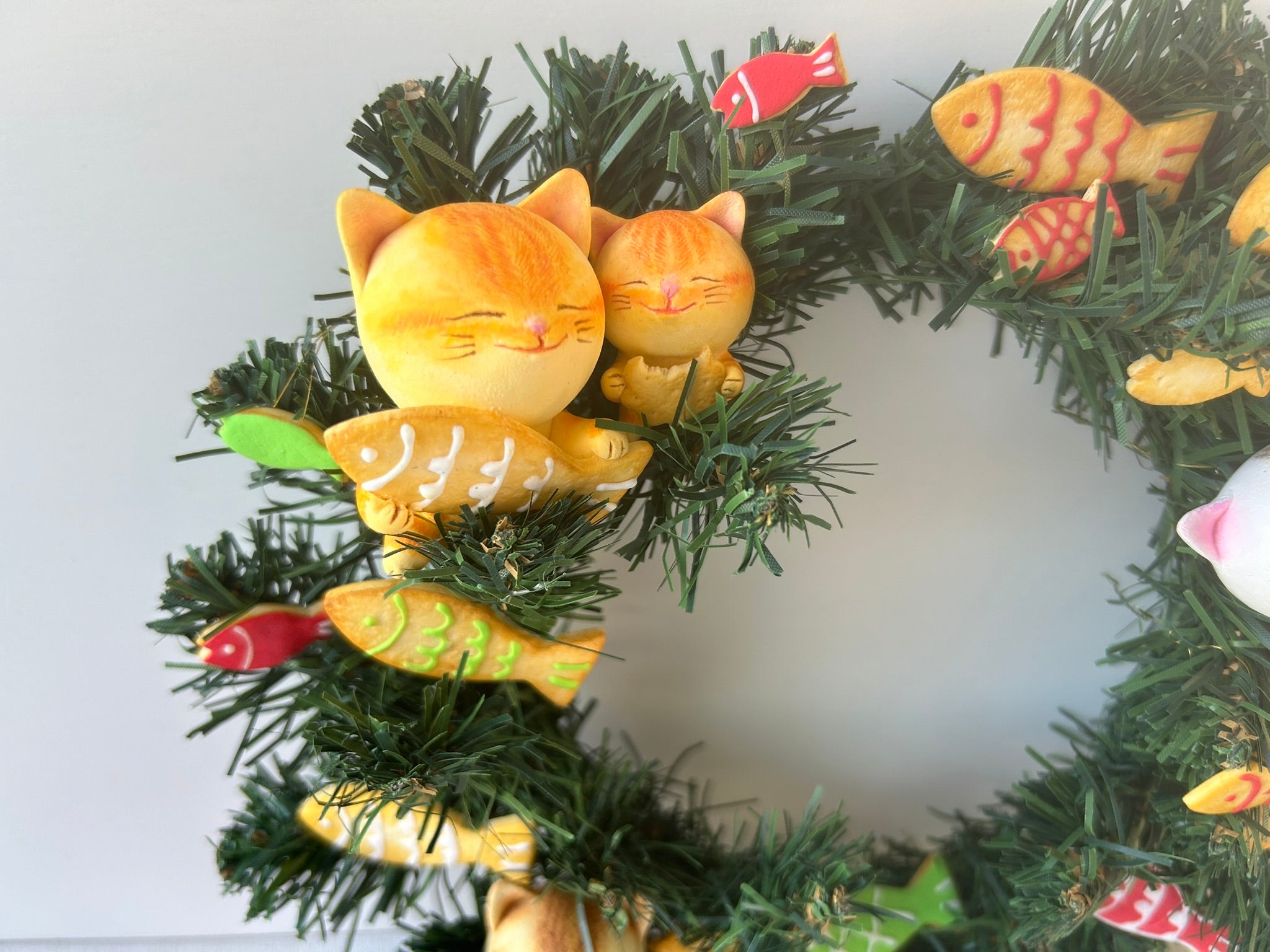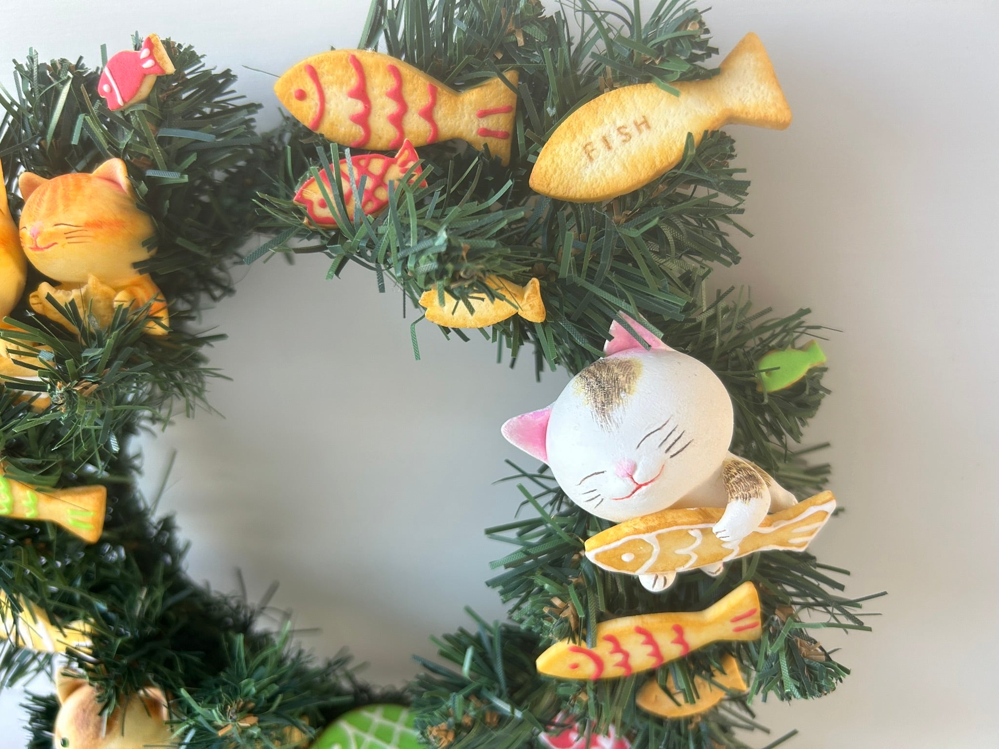 このリースは、愛らしい猫さんとリアルなフェイクスイーツで構成されており、まるで本当に猫さんが楽しそうにお魚クッキーを見つめているかのよう。