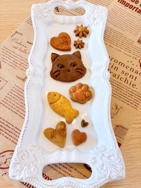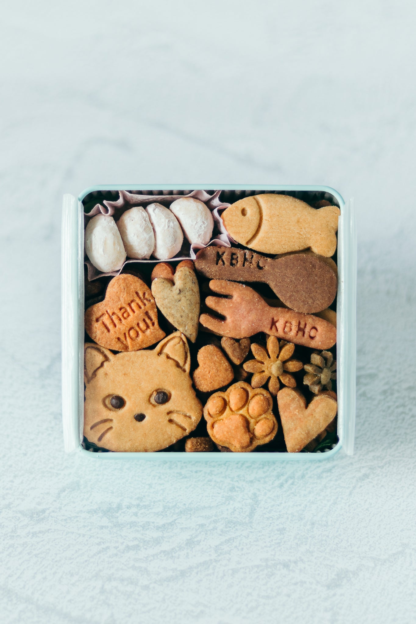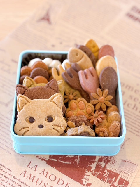 ねこちゃんをメインに肉球、ハート、、魚、スプーン等のクッキーをギュッと可愛らしく缶に詰め込みました。
