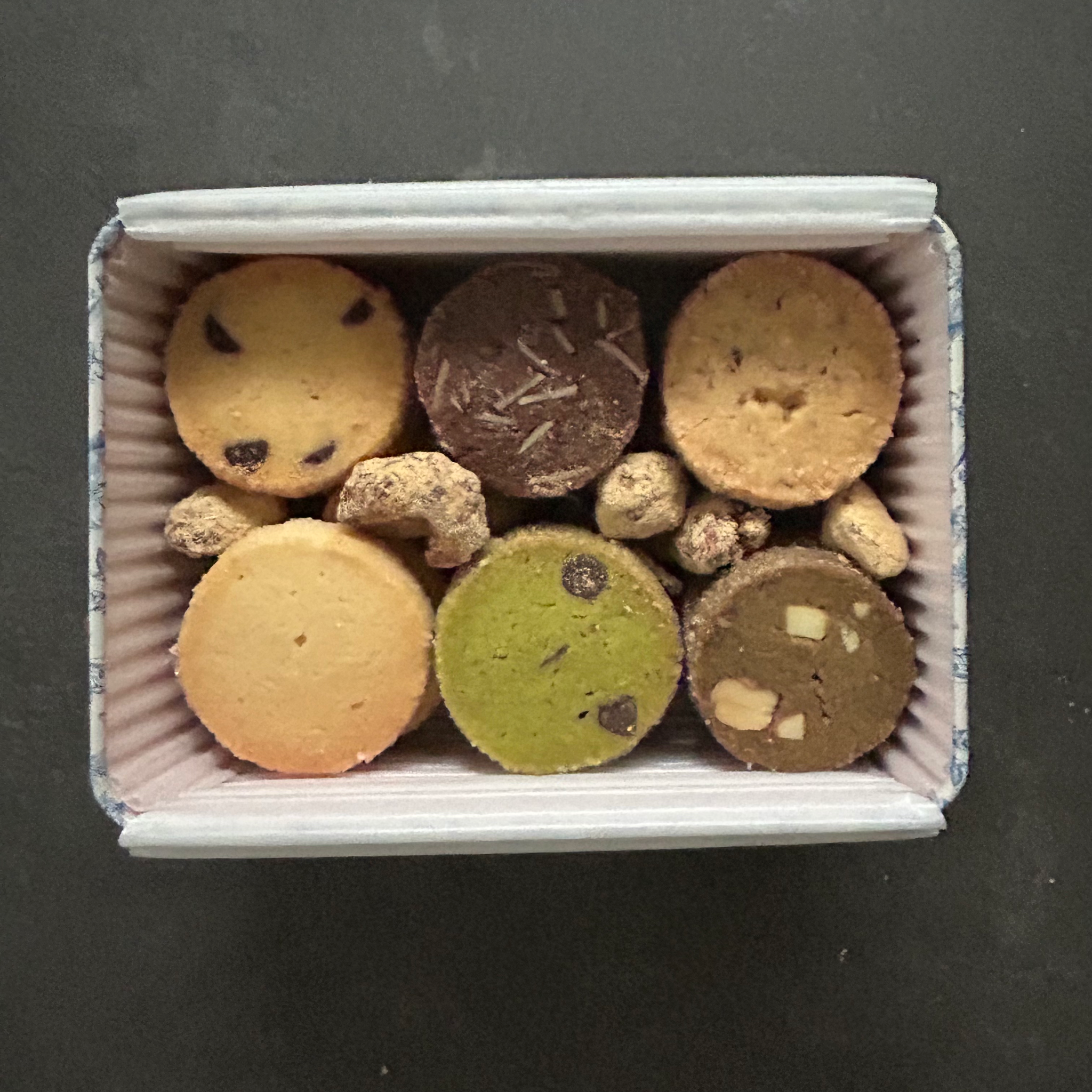 発酵バター(国産)有機小麦粉 砂糖(甜菜糖 黒糖)卵 アーモンド アーモンドパウダー カシューナッツ チョコチップ ホワイトチョコチップ 有機抹茶 有機ほうじ茶 インスタントコーヒー はちみつ 水あめ 生クリーム 粉糖 乾燥卵白 有機きな粉 食塩/ベーキングパウダー(アルミフリー)
