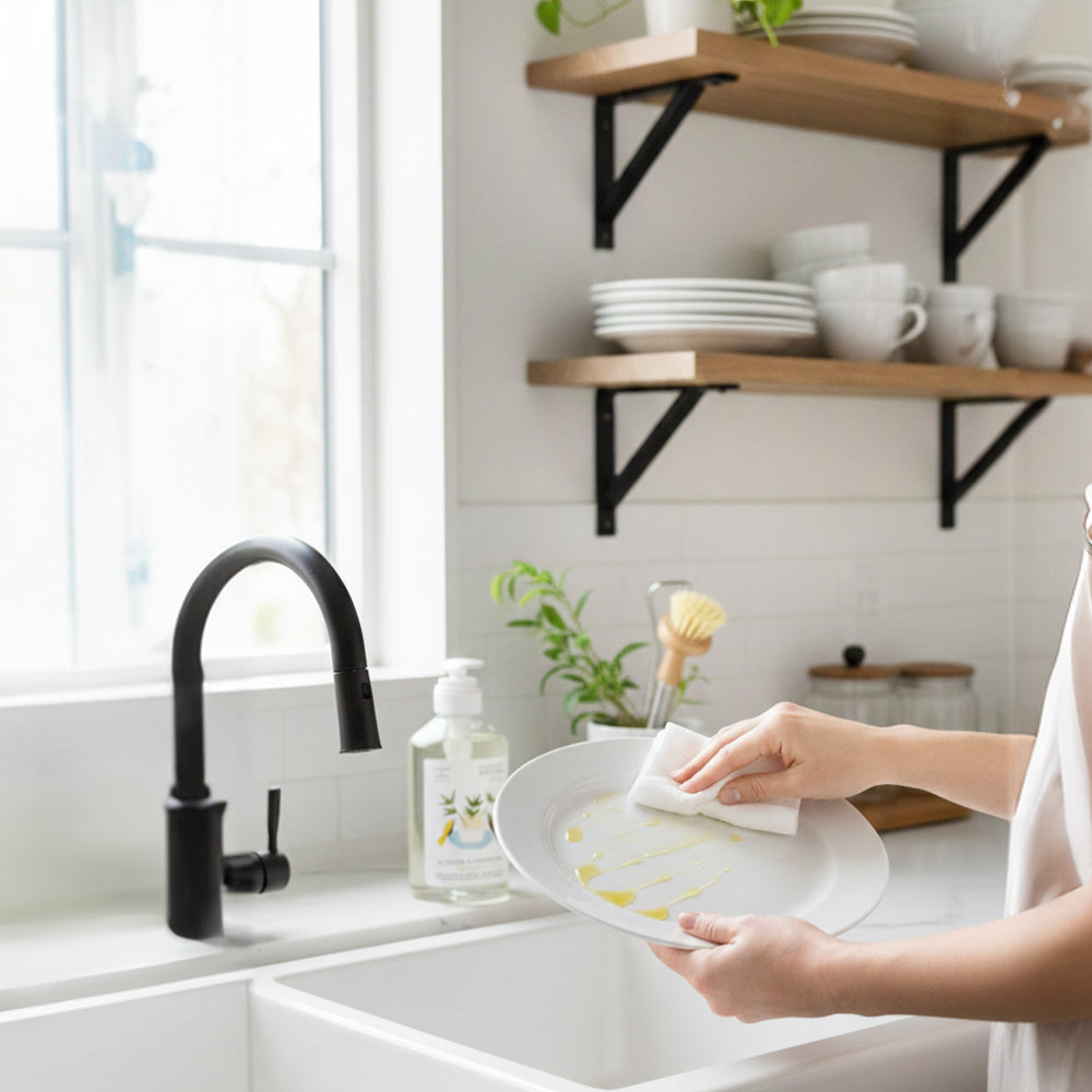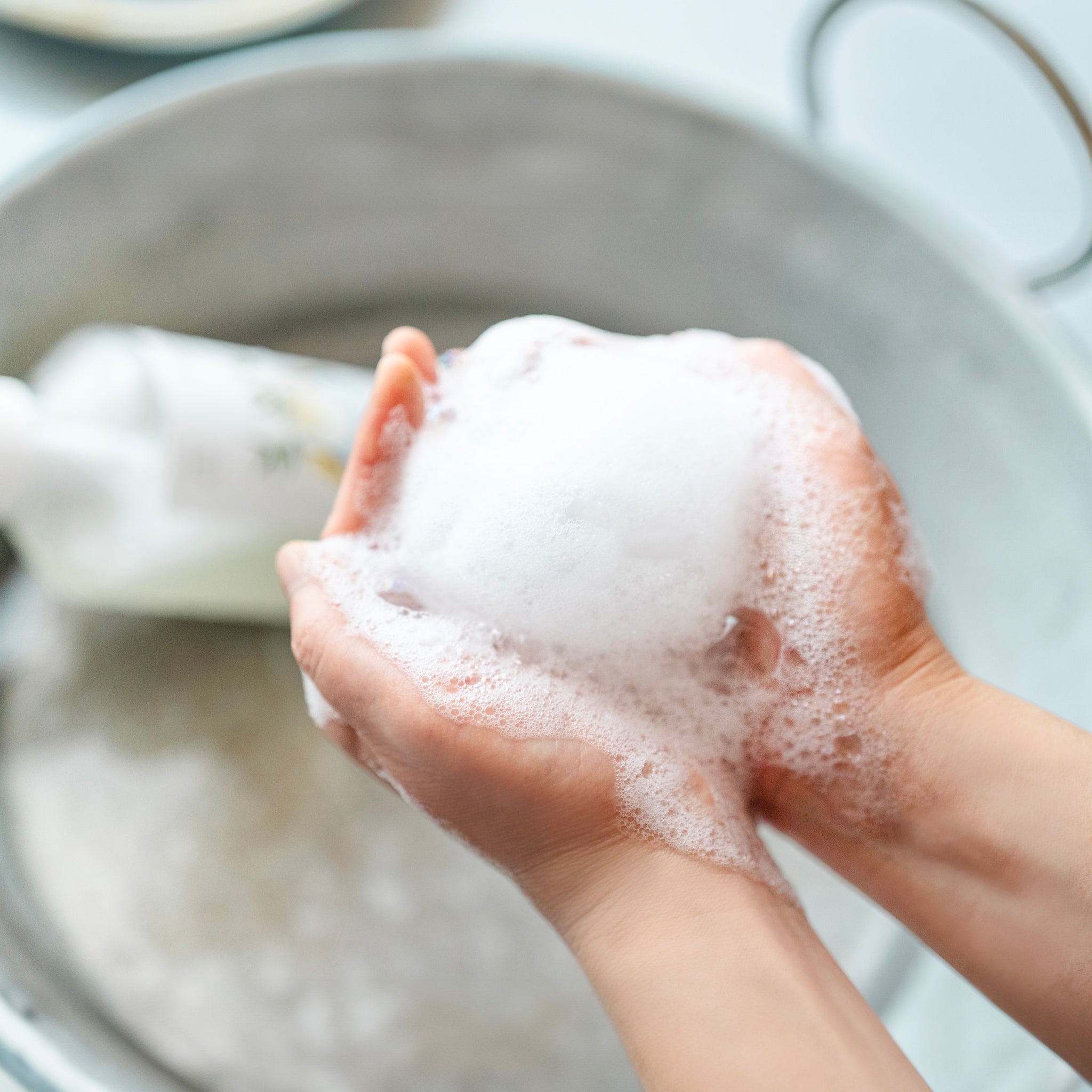ワンプッシュでしっかり泡立ち、汚れをきちんと落とせる心地よさ。泡ぎれがよく、少ない水でスムーズに洗い流せるから、家事の時間も軽やかに。手肌に負担をかけにくい、穏やかな使い心地です。