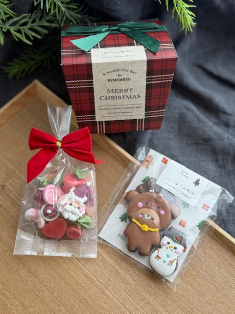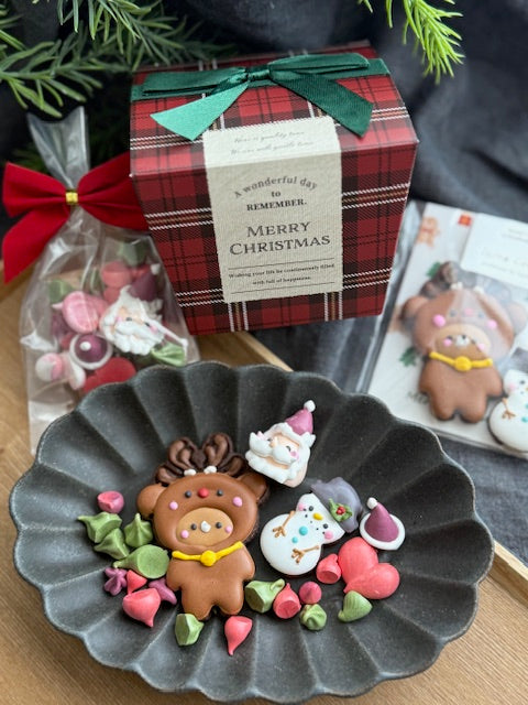 クリスマス限定デザインのアイシングクッキーを、可愛いギフトボックスに詰め込みました。 トナカイや雪だるまなど、人気モチーフを一つ一つ丁寧に手作りアイシングクッキー サンタさんはメレンゲクッキー クリスマスパーティーの手土産や、プチギフトにも最適です。 赤いチェック柄のラッピング箱入りで、そのまま贈れる仕様です🎁 眺めて楽しい、食べて幸せな、期間限定の特別なスイーツをお届けします。