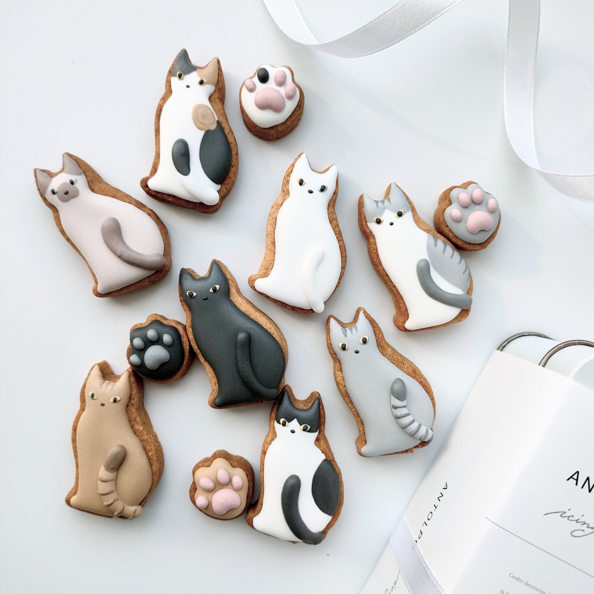 さまざまな毛色の猫と肉球をモチーフにしたアイシングクッキー缶。