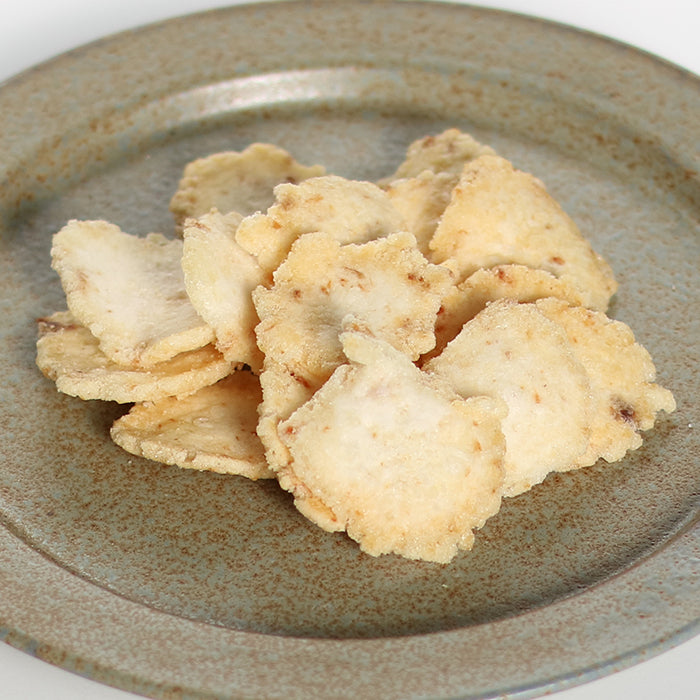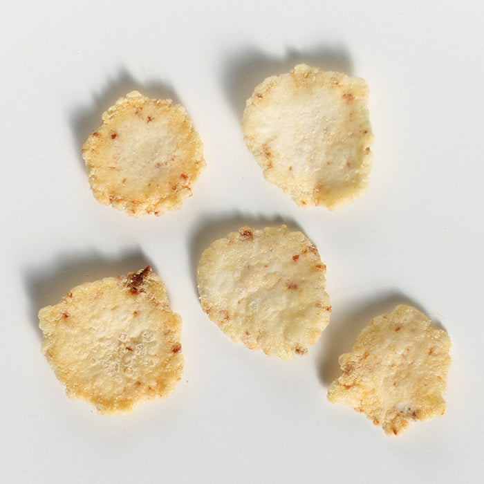 原材料名:煎餅生地(馬鈴薯澱粉(遺伝子組み換えでない)、牛肉そぼろ、海老、その他)(国内製造)、植物油脂、調味塩、ガーリックパウダー/調味料(アミノ酸等)、膨張剤、香辛料抽出物、(一部にえび、小麦、大豆、牛肉、豚肉、いかを含む)
