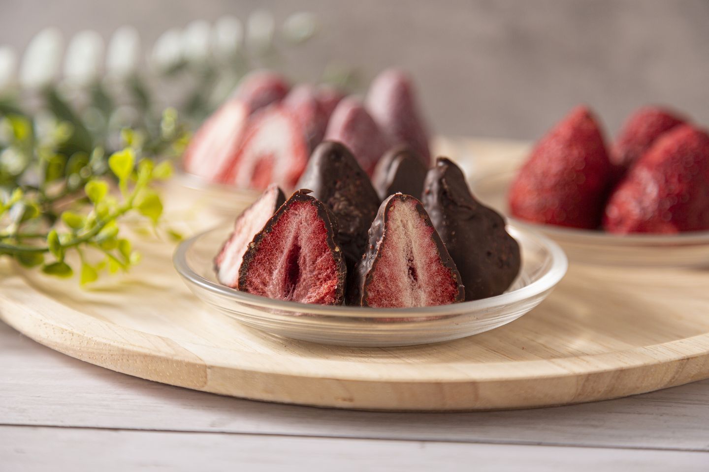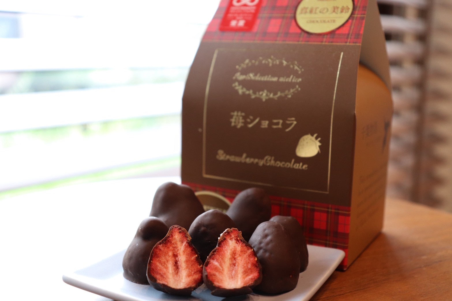 この商品は千葉県発祥の苺『真紅の美鈴』をフリーズドライし、極薄にチョコレート掛けをしたお菓子です。