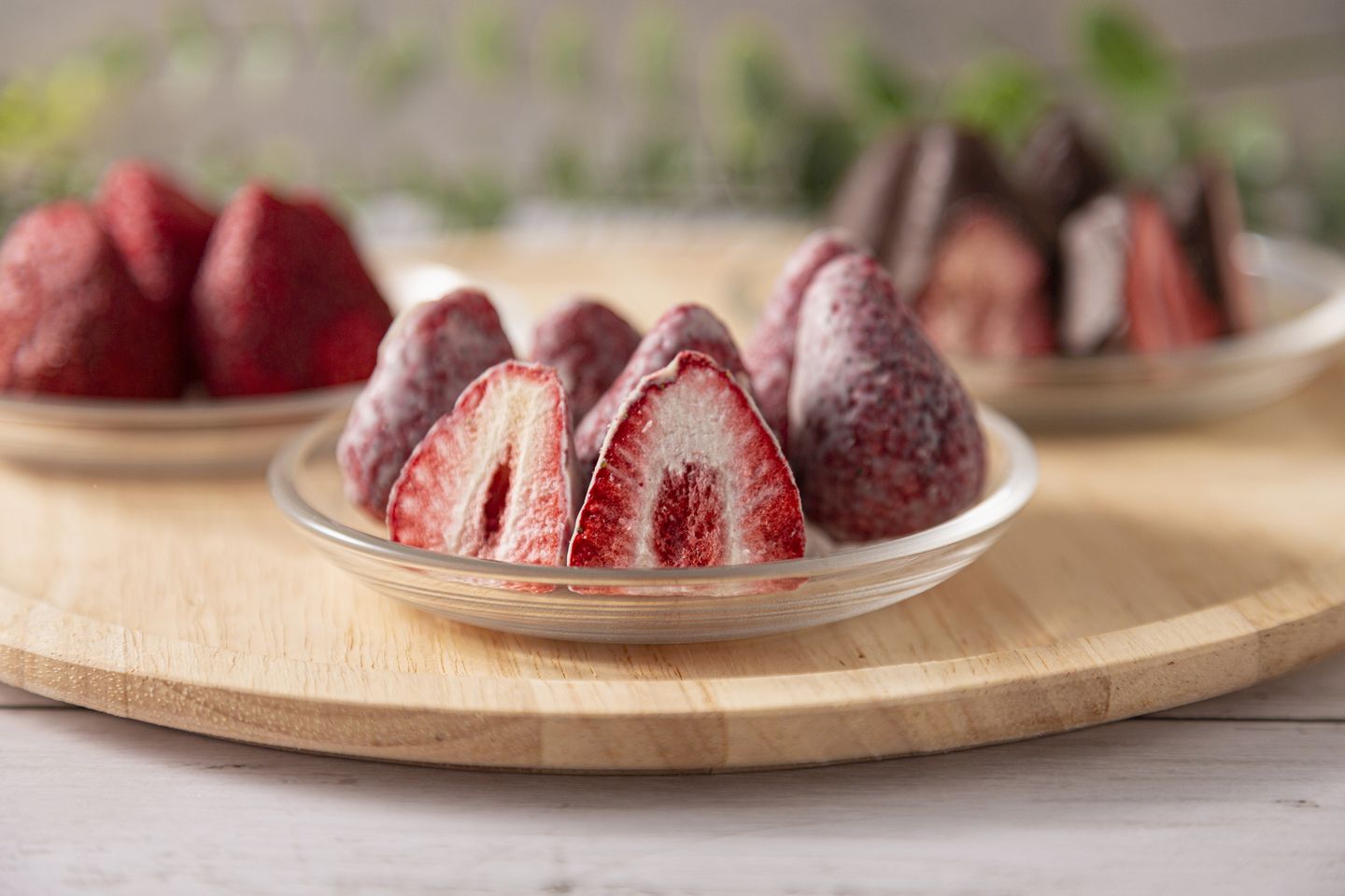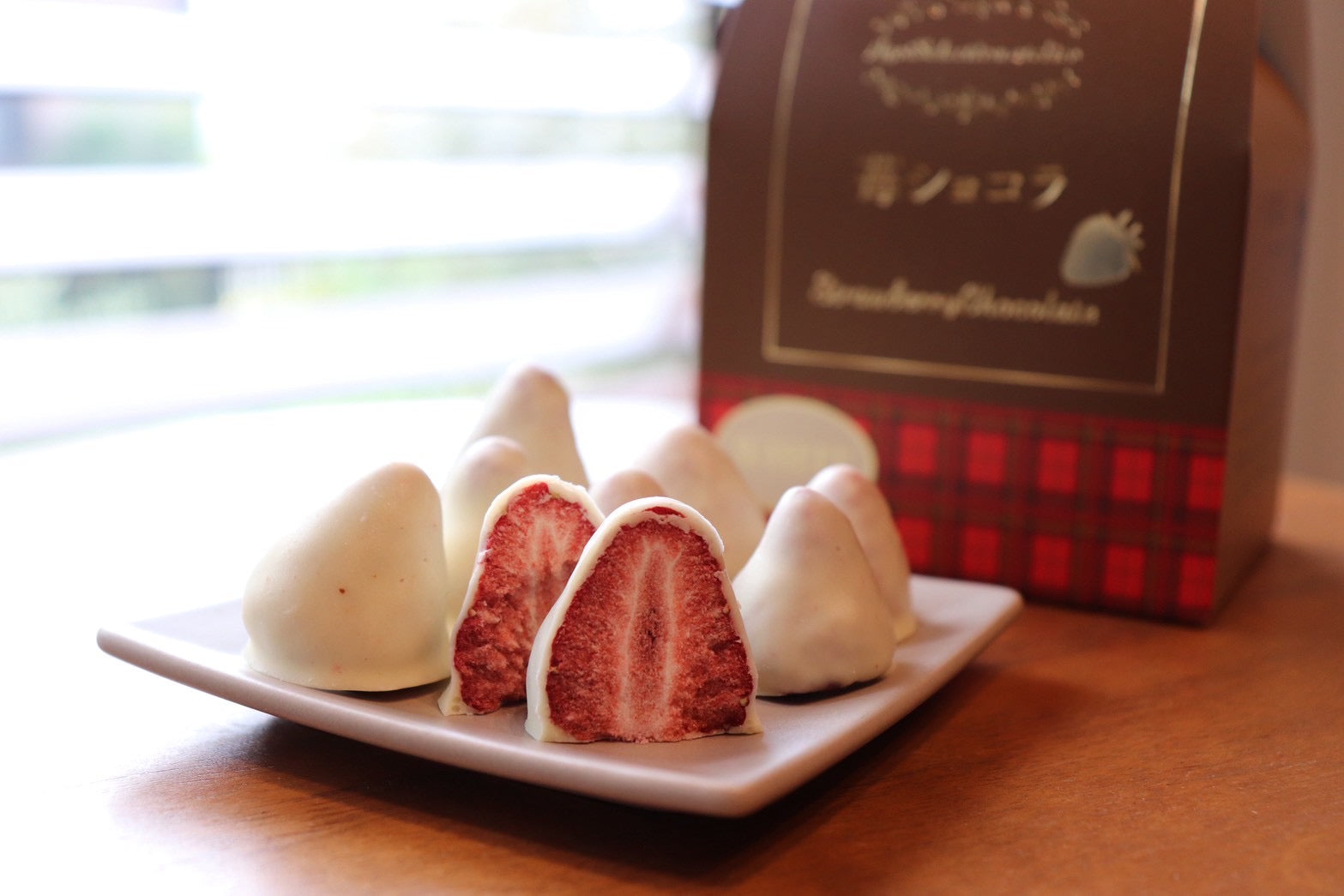 この商品は千葉県発祥の苺『真紅の美鈴』をフリーズドライし、極薄にチョコレート掛けをしたお菓子です。