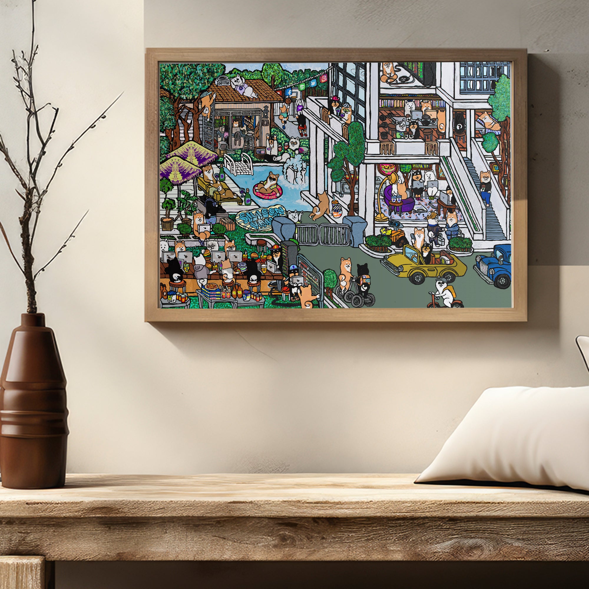 ITの聖地・シリコンバレーで、自由に、クリエイティブに働く柴犬たちの姿を描いたA3ポスター『シリコンバレーの柴犬達』。