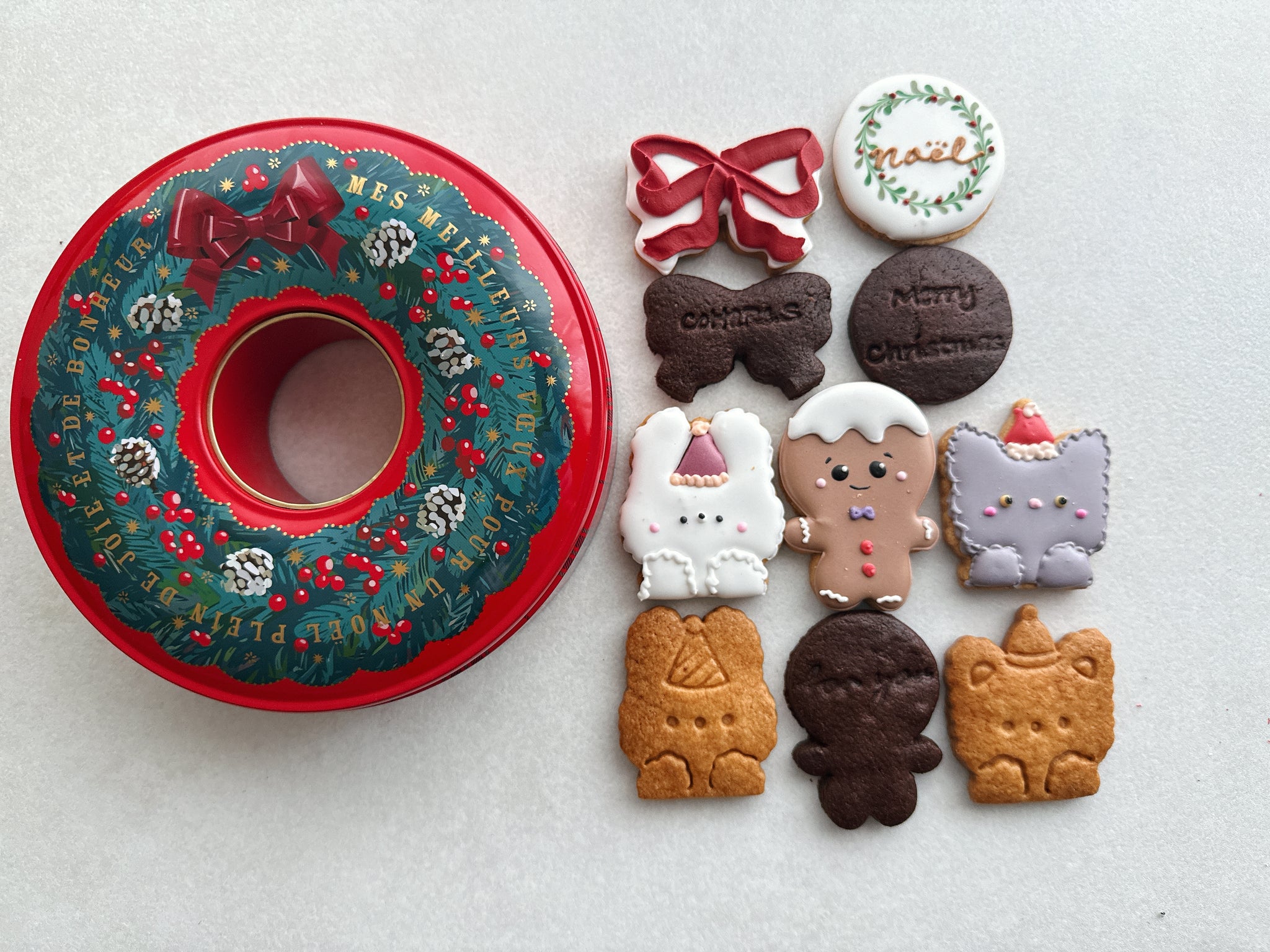 クラシックなクリスマスリース缶に、ハンドメイドのアイシングクッキーを贅沢に詰め込んだ限定アソート。ホリデー気分を象徴するジンジャーマンやリボン、季節の植物を描いた”noël”クッキー、サンタ帽をかぶったキャットクッキーなど、遊び心のあるラインナップが魅力です。美しいデザインと繊細なアイシング技術が楽しめる、贈り物にも最適なギフトセット。
