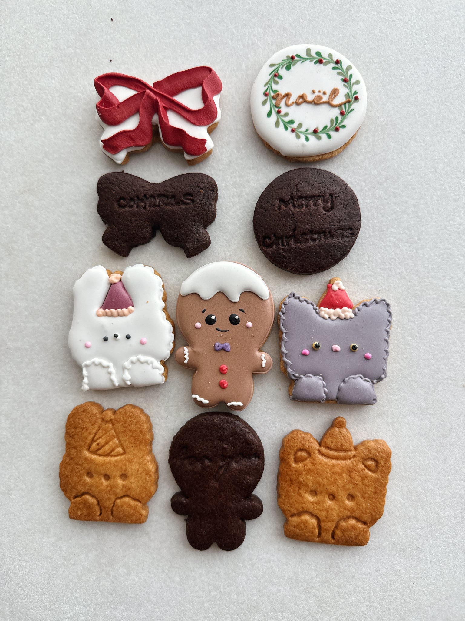 ザクっと香ばしい食感とやさしい甘さが広がる、クッキーたち。 プレーンとココアの2種類の味わいが、素朴ながらもしっかりとした存在感を放ちます。 それぞれに「Merry Christmas」の刻印入りで、ちょっと特別な気持ちを添えて。 ほっとする午後のおやつ時間にぴったりの一枚です。 アイシングクッキーにプレーンクッキー、ココアクッキーが入ってます。