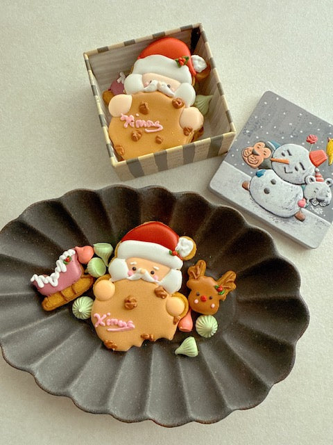 クッキーを抱えてにっこり微笑むサンタさんと、ちょこんと寄り添うトナカイ、そして可愛らしいソリ。クリスマスの物語をそのまま切り取ったようなミニクッキーセットです。手描きの温かみを感じるアイシングと、雪だるまが描かれたオーナメント風のギフトBOXがホリデー気分を贅沢に演出します。