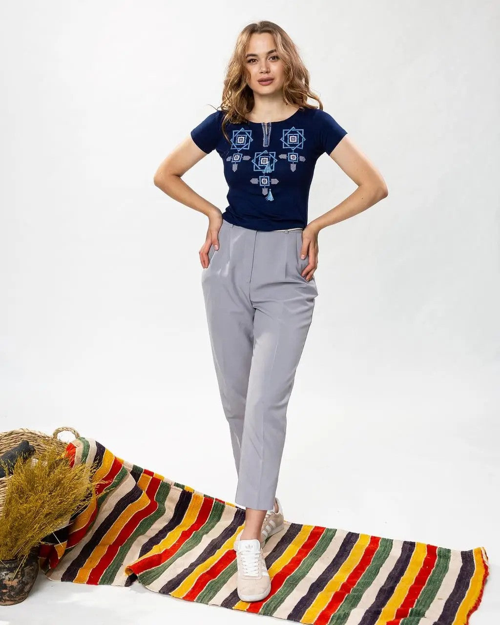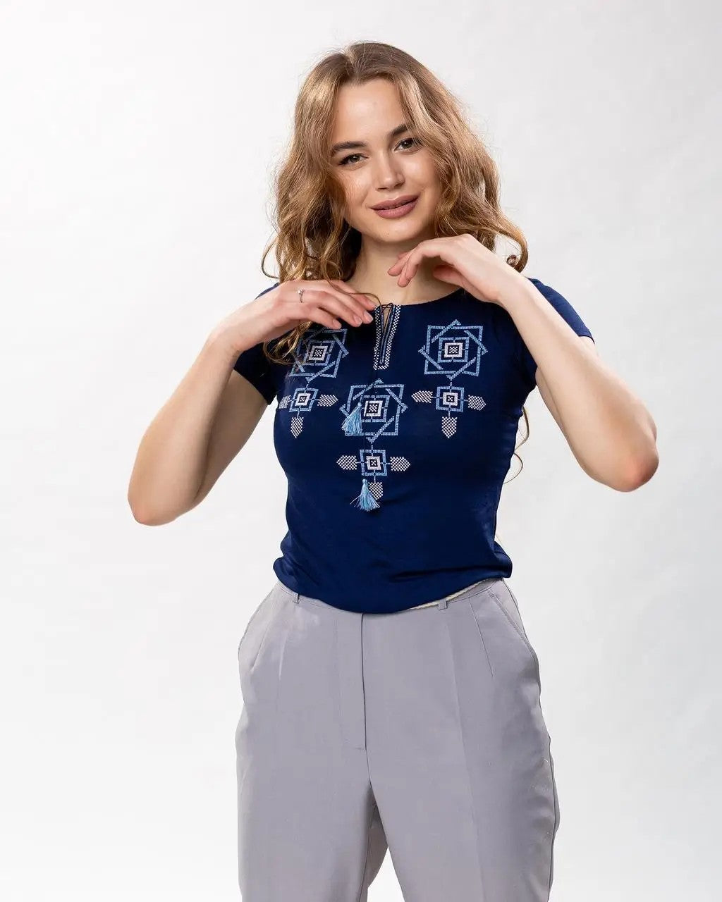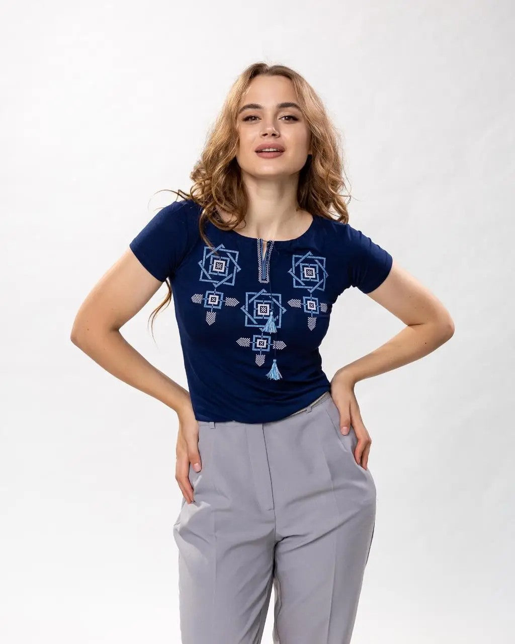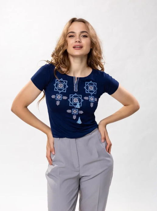 ウクライナ伝統の幾何学刺繍がモダンに映える一着。胸元にはブルー系の糸で繊細に仕上げた模様と、アクセントとして小さなタッセルがあしらわれています。やや伸縮性のある柔らかい生地で、体に心地よくフィット。デニムやスカート、シンプルなパンツスタイルにも合わせやすく、日常に民族のエッセンスを取り入れたい方にぴったりです。
