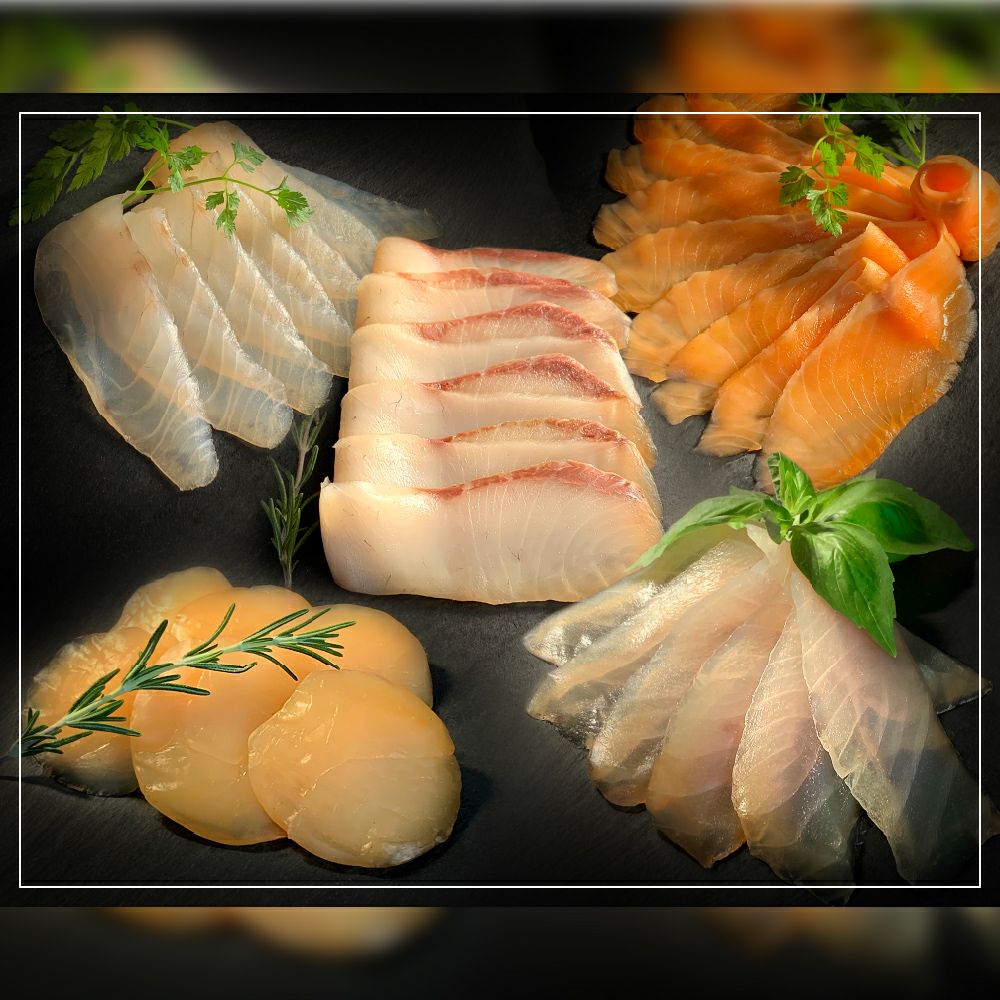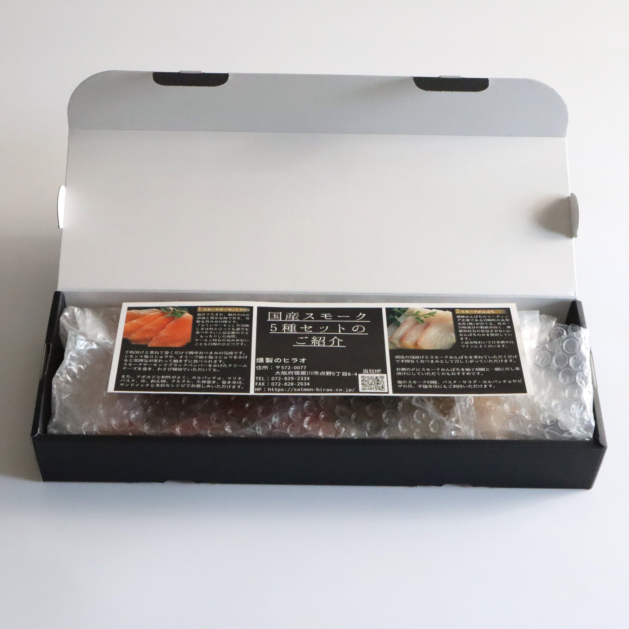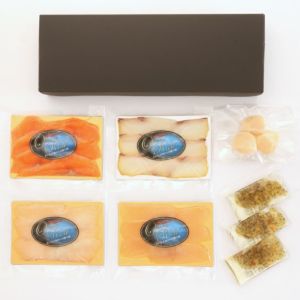 【スモークカンパチ】養殖カンパチ(宮崎県串間産)、醤油(大豆・小麦を含む)、食塩、砂糖、みりん 【スモークカジキ】クロカジキ(国産)、食塩、砂糖、白ワイン、香辛料 【スモークタイ】養殖真鯛(国産)、食塩、砂糖、香辛料 【スモークサーモン】養殖サーモントラウト(国産)、食塩、砂糖、香辛料 【スモークホタテ】帆立貝柱(国産)、食塩、砂糖