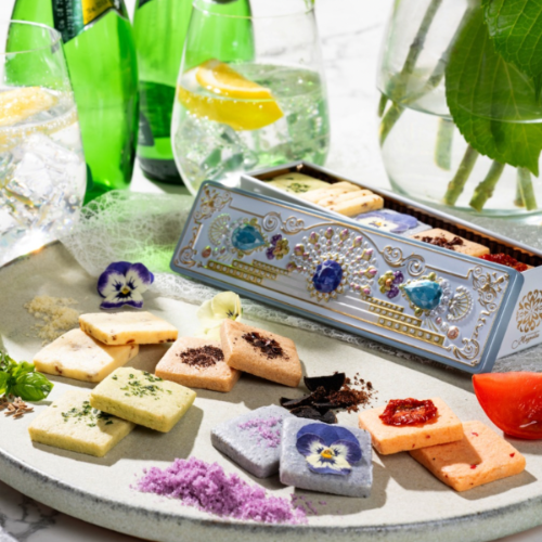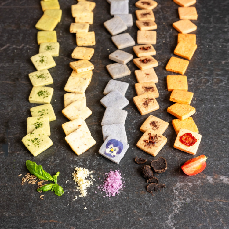 すみれ塩(4枚)、トマトピンクペッパー(4枚)、カカオトリュフ(4枚)、フロマージュ(4枚)、グリーンカリー(4枚)