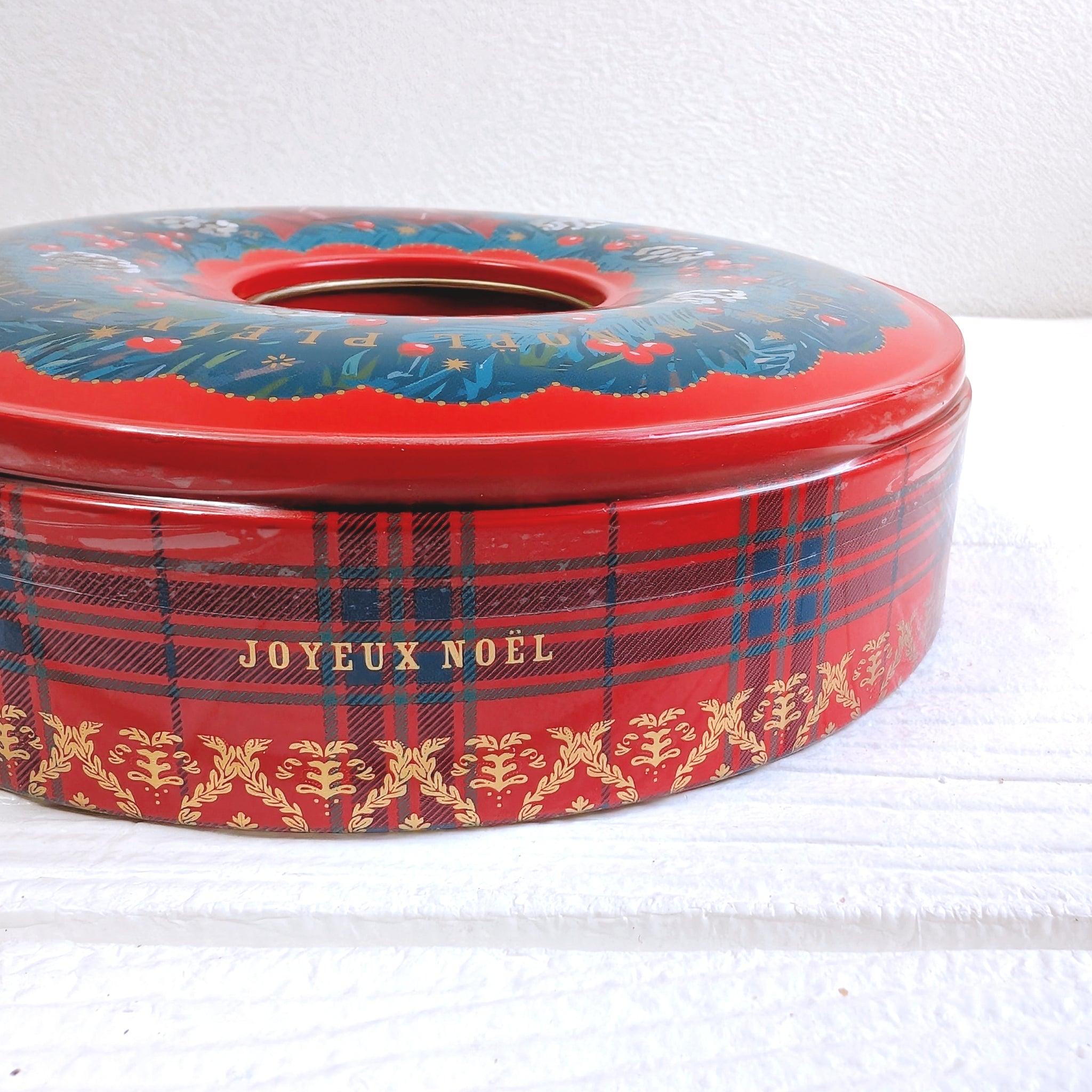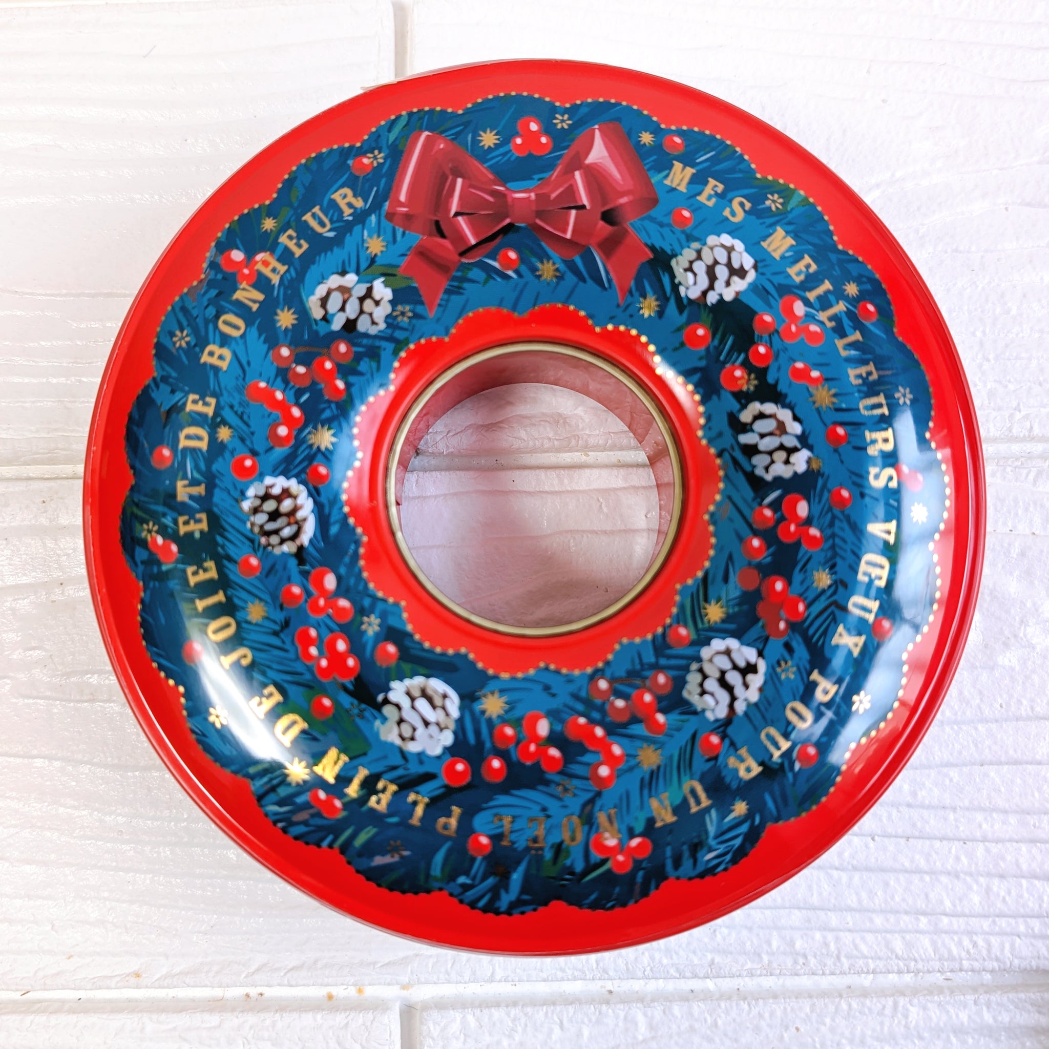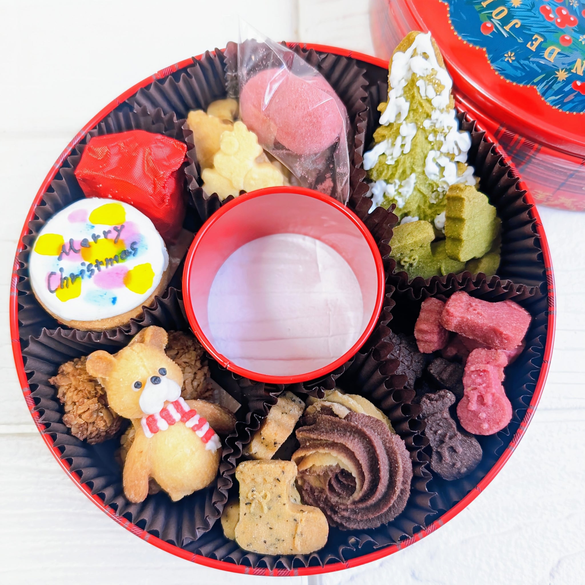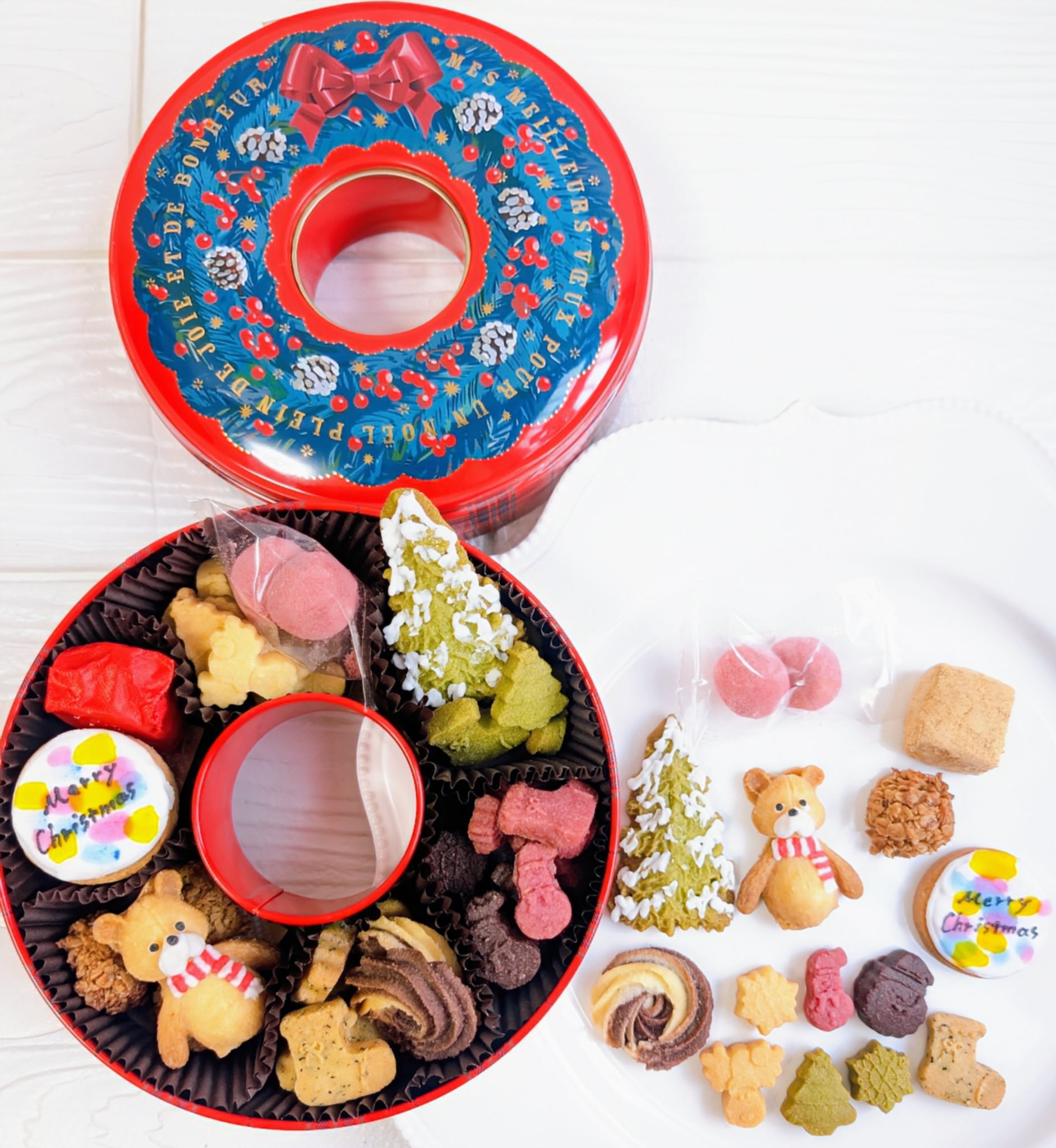 可愛いクリスマスリース型の缶を開けるとクリスマスを存分に楽しめるクッキー達が12種類入ってます